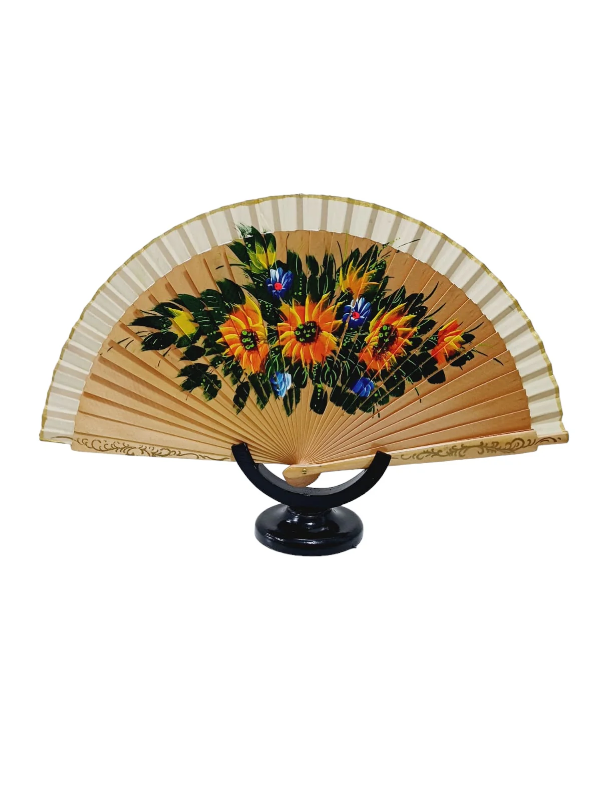 Abanico español elaborado en madera, con imagen de flores pintadas a mano y borde color crema.