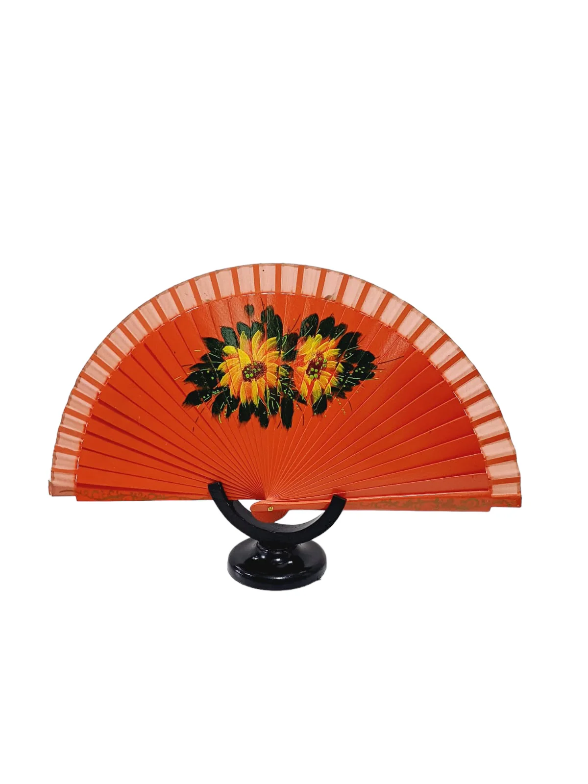 Abanico español elaborado en madera, con imagen de flores pintadas a mano y borde color naranja.
