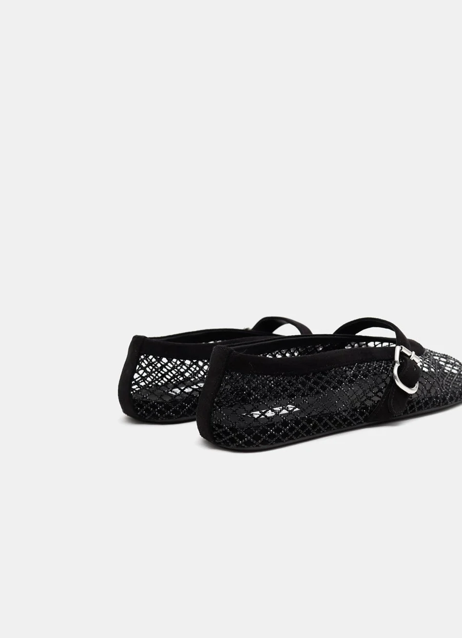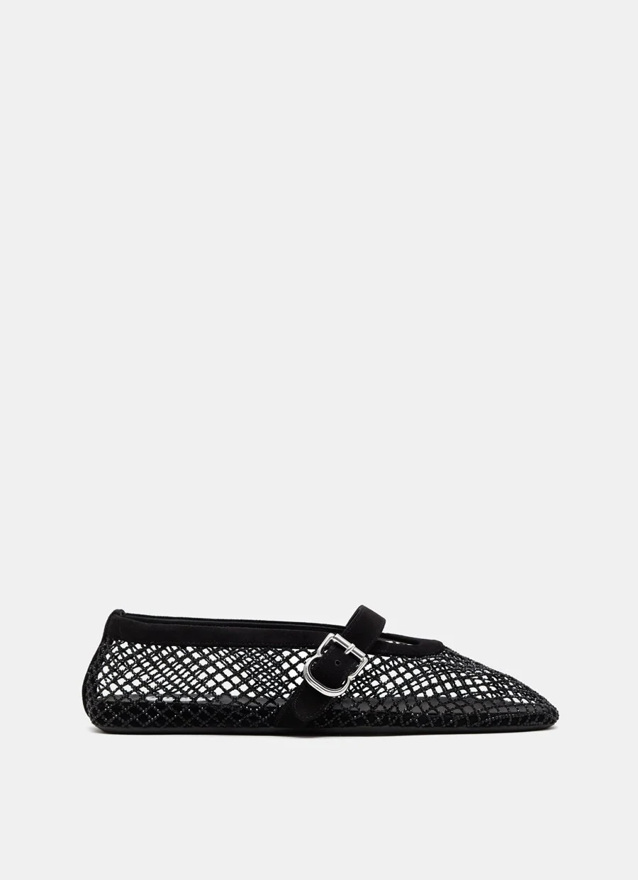 Bailarina de Alaïa en rejilla decorada con pedreria, suela plana y tira ajustable con hebilla de metal. Detalles de ante de cabra. Inspiradas en el calzado clásico japonés. Hechas en Italia. Talla normal, elige tu talla habitual. Tallaje UE.