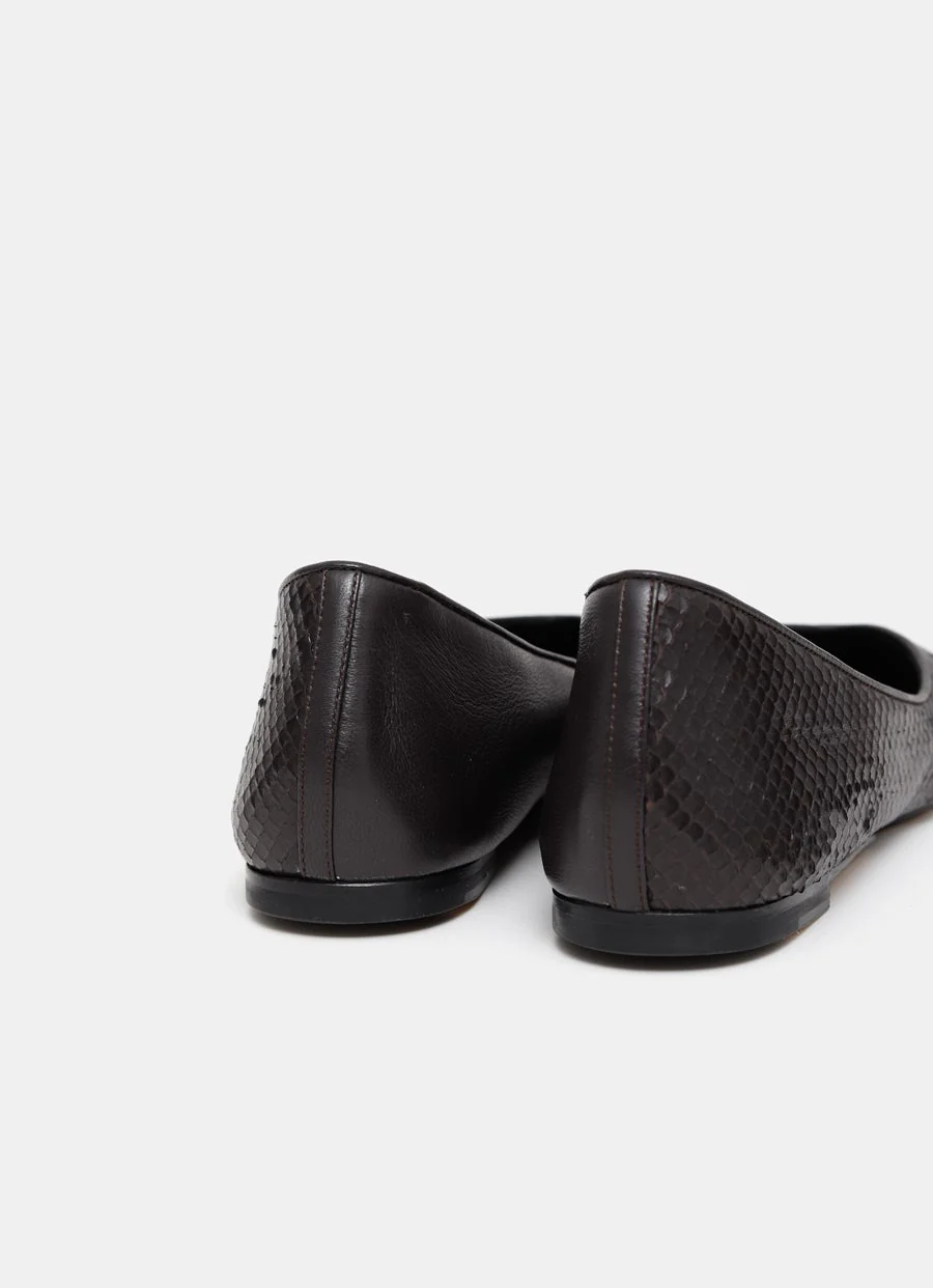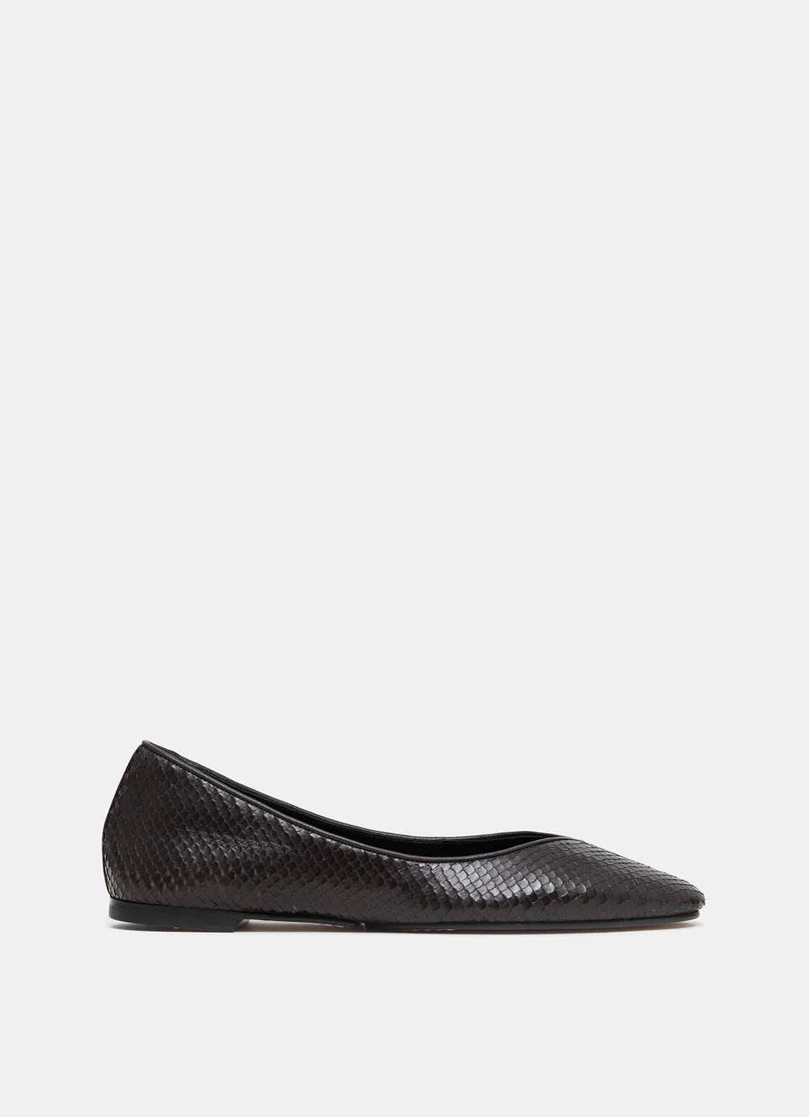 Bailarina plana de Jacquemus en piel con textura de serpiente, puntera ovalada y detalle de puntada. Plantilla acolchada y forro de piel. Hecha en Portugal. Talla normal, elige tu talla habitual. Tallaje UE.