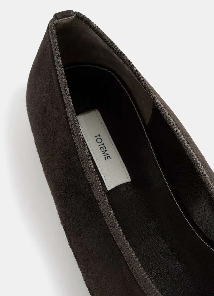 Bailarinas de TOTEME en ante suave con puntera cuadrada, parte superior elástica y forro, plantilla y suela de piel. Hecho en España. Talla normal, elige tu talla habitual. Tallaje UE para mujer.