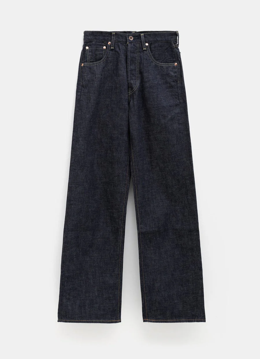 Pantalón vaquero de Chimala en denim japonés de corte ancho y recto, cinco bolsillos, cierre de botones y costuras en contraste. Hechos a mano en Japón. Talla normal, elige tu talla habitual.