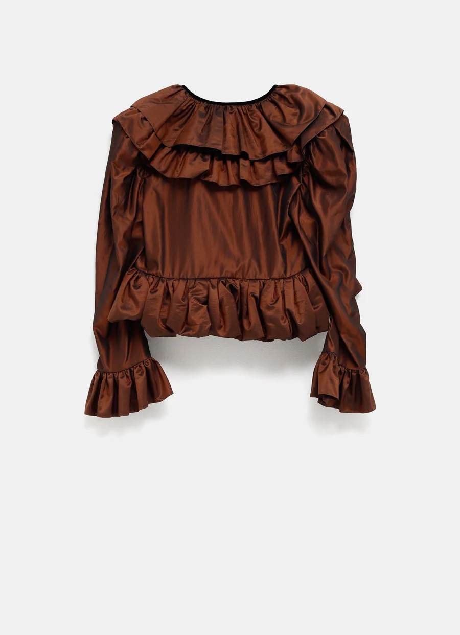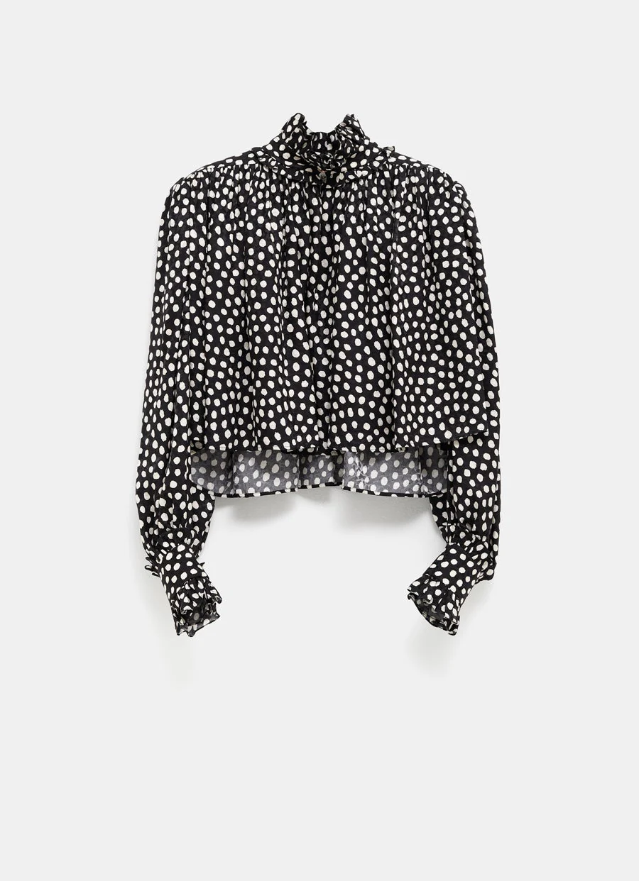 Blusa de Chloé en seda con lunares, cuello alto con lazada, decorado con volantes, cierre con botón en la parte frontal y manga larga. Corte fluido. Hecho en Italia. Talla normal, elige tu talla habitual. Tallaje UE.