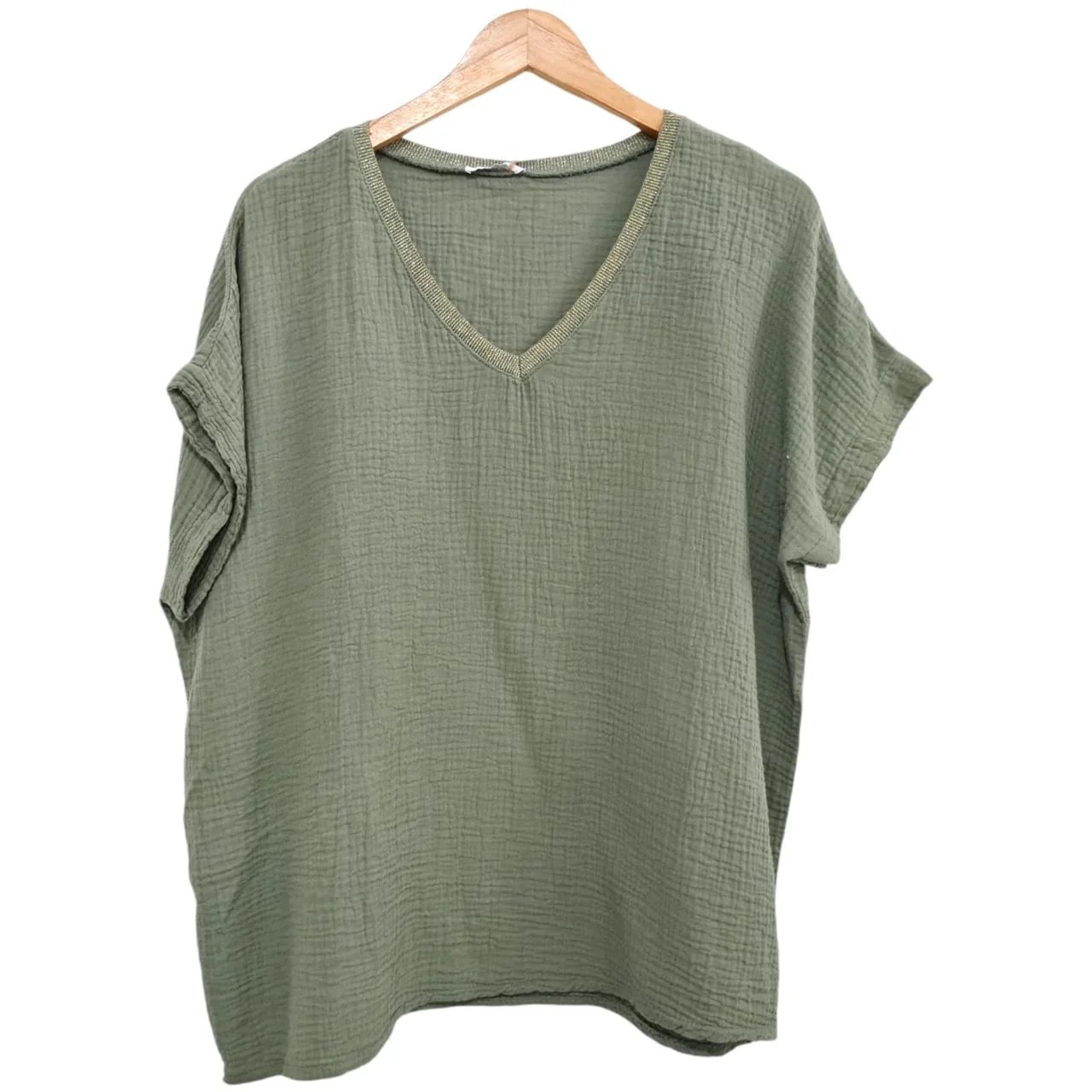Blusa ligera 100%. lino, color verdel, manga corta cuello chino de dos botones al frente espalda y bolsillo troquelado.