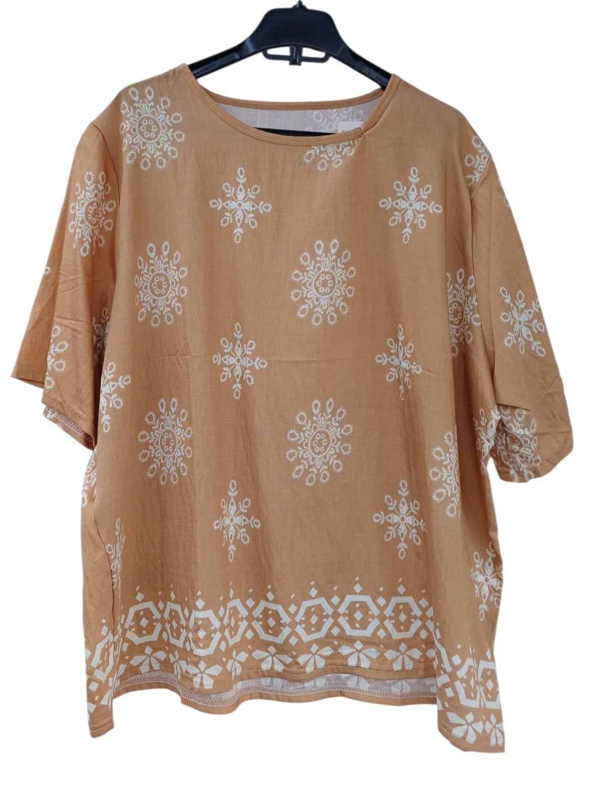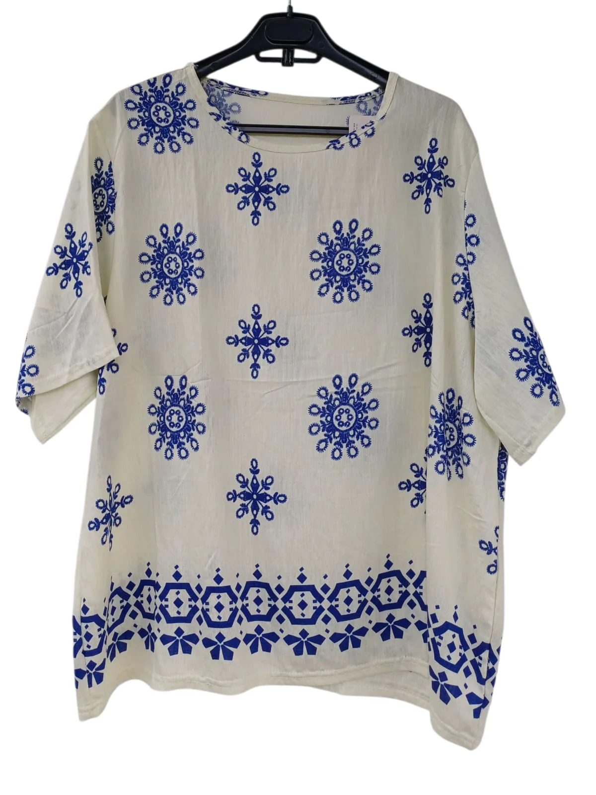 60% VISCOSA 35% LINO 5% ELASTANE. BLUSA MANGA CORTA CUELLO REDONDO ESTAMPADAS.