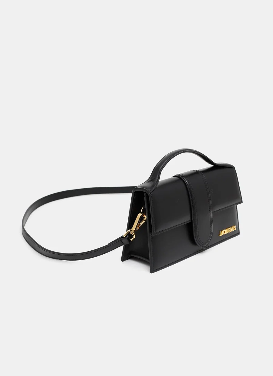 Bolso de mano de Jacquemus con asa pequeña, correa bandolera ajustable y extraíble, solapa con cierre magnético, bolsillo posterior para tarjetas, y detalle de placa metálica con logo. Hecho en Italia. Medidas: 23,5 x 13 x 7 cm.