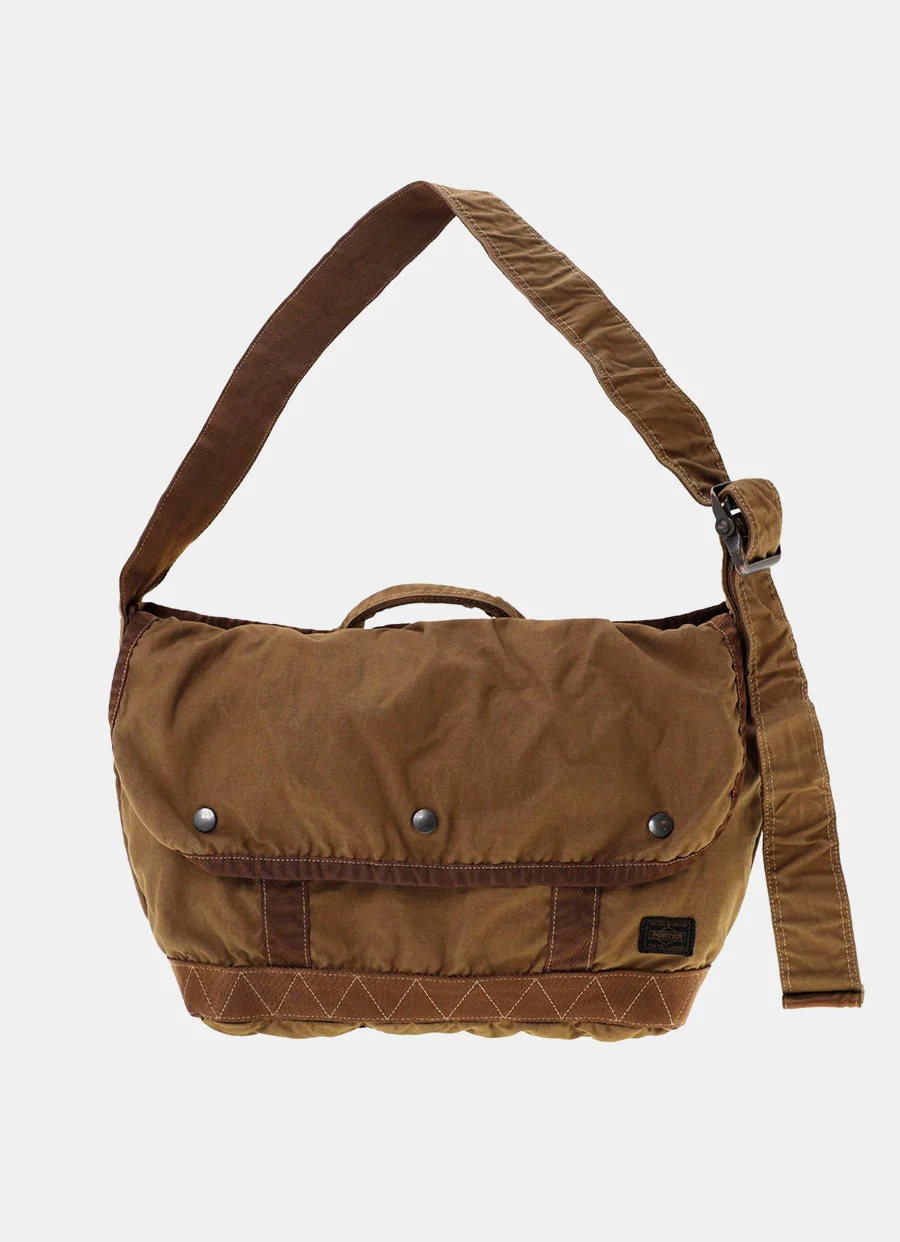 Bolso bandolera de lona de Porter-Yoshida & Co., parte de la serie Porter Crag. Se puede llevar en la mano, al hombro o cruzado. Cierre de solapa superior con cierre de botones a presión, cierre superior en el interior con mosquetón, un bolsillo exterior, asa superior, múltiples bolsillos interiores, correa ajustable, y costuras reforzadas. La textura y el color del artículo puede variar ligeramente debido al proceso de teñido y secado. Hecho en Japón. Medidas: 42 x 30 x 14 cm.