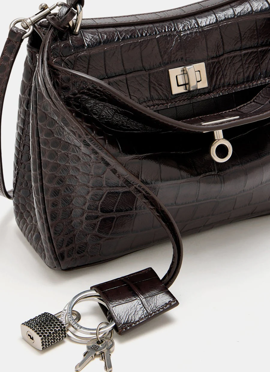 Bolso de mano de Balenciaga en piel de becerro con textura de cocodrilo. Con asa para llevar en la mano, correa bandolera ajustable y extraíble de 69 cm, cierre giratorio, bolsillo ancho en la parte delantera, un compartimento principal, dos bolsillos planos en la parte trasera, cierre a presión en los laterales, cuatro pies de latón y forro en piel de napa de cordero. Hecho en Italia. Tamaño: 22,8 x 17 x 9,9 cm aprox.
