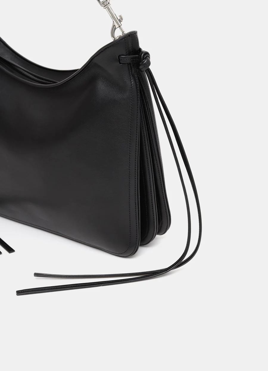 Bolso de Phoebe Philo en piel de becerro con costuras a tono, herrajes plateados, detalle de lazo de piel y cierre de cremallera. Tres compartimentos, correa ajustable y removible de hasta 103.5 cm. Se puede llevar cruzado o colgado del hombro. Forro de ante. Hecho en Italia. Tamaño: 26 x 31 x 9 cm.