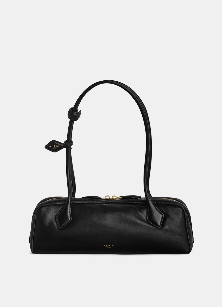 Bolso de Alaïa en piel de napa de cordero suave acolchada. Para llevar al hombro, con cierre de cremallera doble superior, logo estampado, espejo pequeño extraíble en el bolsillo interior y asas largas tubulares con detalle de lazo. Hecho en Italia. Tamaño: 33 x 11 x 10 cm.