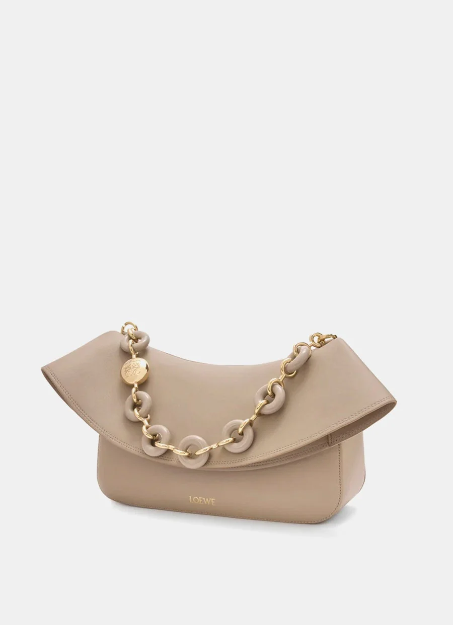Bolso de Loewe en piel de becerro lisa con cuerpo curvo, solapa fluida y cadena con diseño de donut. Asa tubular desmontable en piel de becerro y cadena, un bolsillo interior y anagrama grabado en relieve dorado. Hecho en España. Dimensiones: 18 x 26 x 13cm.