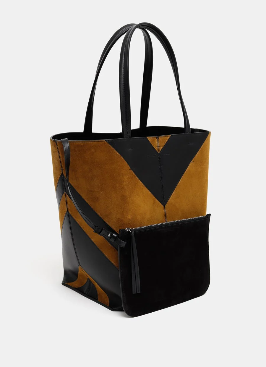 Bolso tote de Phoebe Philo a rayas intarsia de piel y ante, con bolsillo interior removible, cierre de mosquet贸n, logo en relieve, asas de piel con 23.5 cm y forro de ante. Hecho en Italia. Medidas: 35 x 26 x 22 cm.