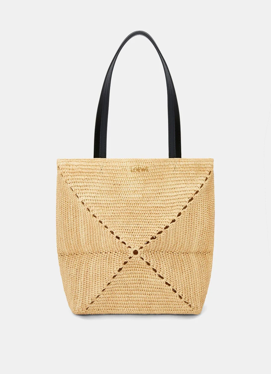 Bolso de Loewe de rafia tejida a mano con diseño de paneles que permiten que se pliegue completamente. Con asas de 27 cm en piel. Para llevar al hombro o en la mano, sin forro y con logo de metal dorado. Tamaño: 31.5 x 25.5 x 14.5 cm.