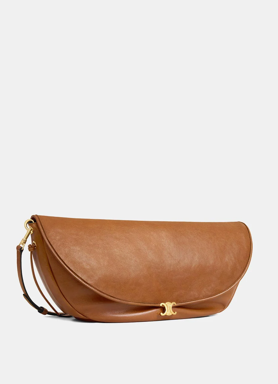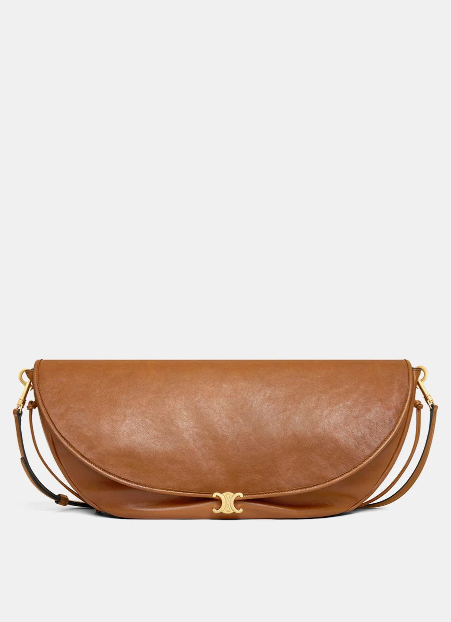 Bolso de Celine en piel de cordero flexible y brillante con forma de medialuna. Un compartimento principal, un bolsillo exterior con cremallera bajo la solapa, un bolsillo exterior con cremallera en la parte trasera, correa extraíble y ajustable con una longitud máxima de 44,5cm. Forro de ante de becerro. Para llevar al hombro o cruzado. Hecho en Italia. Dimensiones: 46 x 19 x 10cm.