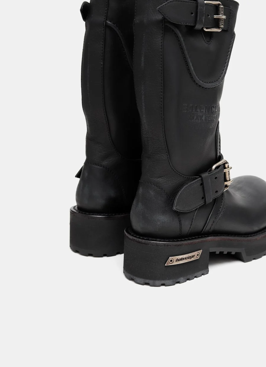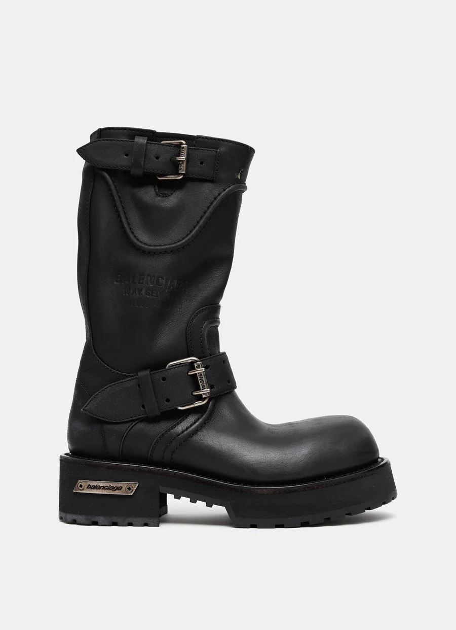 Bota de Balenciaga en piel de becerro con puntera extrarredonda, efecto desgastado, correas ajustables con hebillas de cinturón, logos repujados en la parte superior y suela gruesa dentada de caucho con placa de metal con logo. Hecha en Italia. Talla normal, elige tu talla habitual. Tallaje francés para mujer.