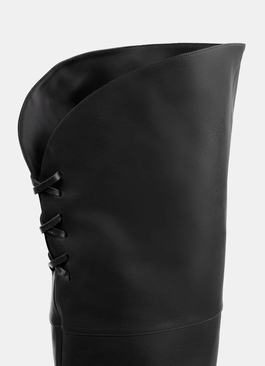 Bota de Chloé en piel de becerro con puntera almendrada, tacón forrado de 8.5 cm, y plantilla y suela de piel con logo. Largo por encima de la rodilla. Hecha en Italia. Talla normal, elige tu talla habitual. Tallaje UE.