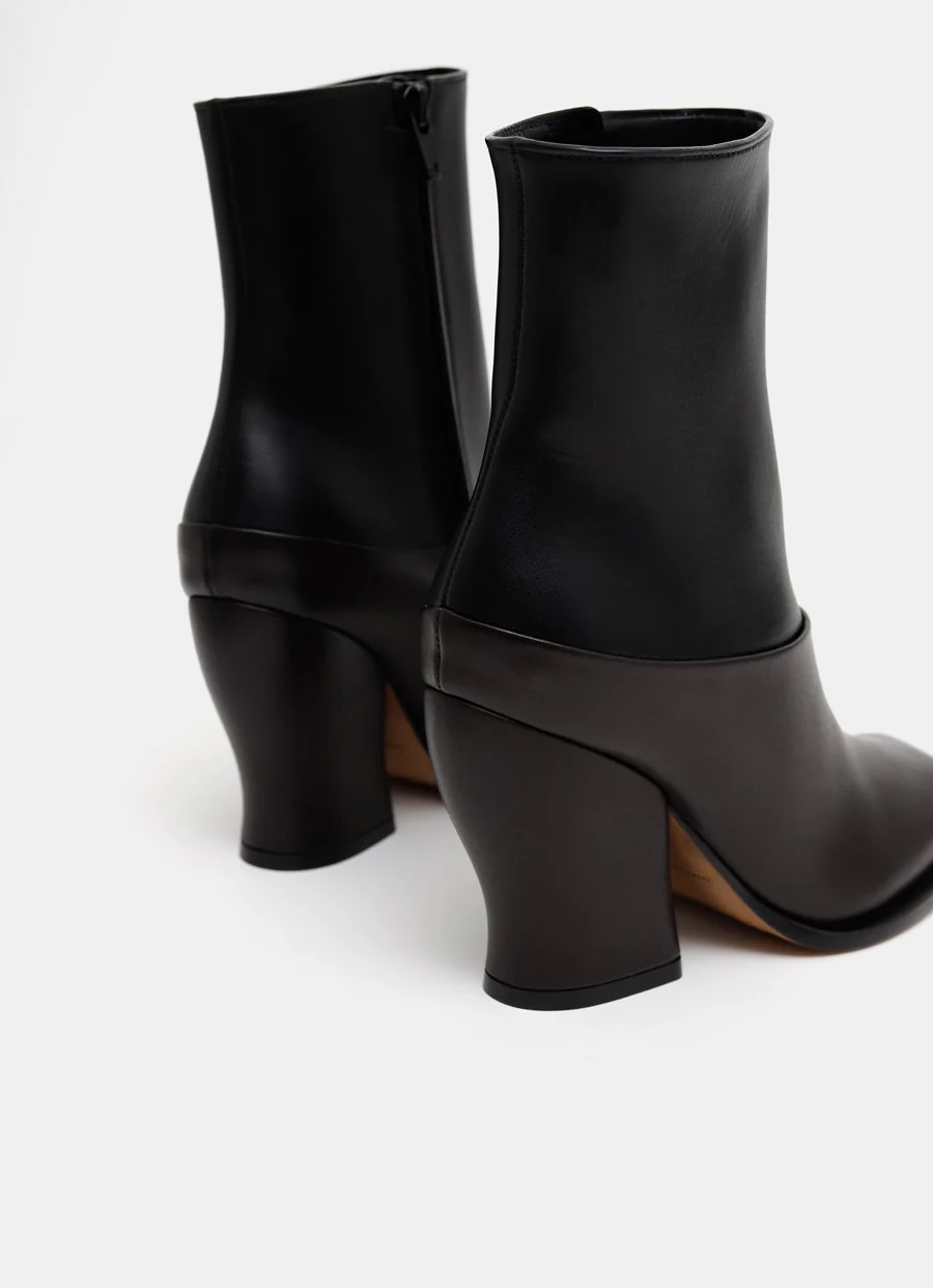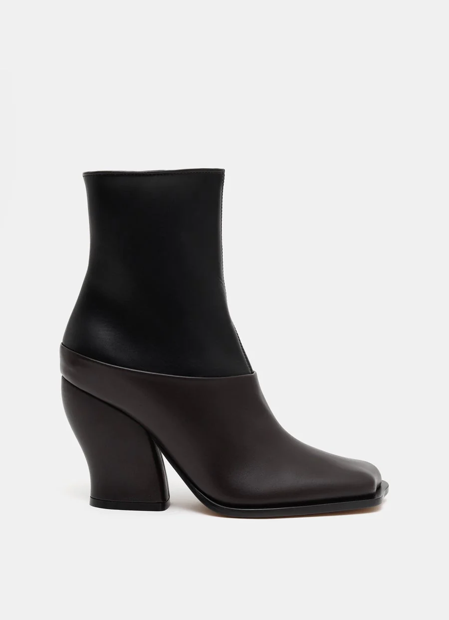 Botín de Loewe en piel de ternera bicolor con puntera ondulada asimétrica y tacón gruesa Onda. Con cremallera interna, suela y plantilla en piel, y tacón de 90 mm. Hecho en Italia. Talla normal, elige tu talla habitual. Tallaje francés para mujer.