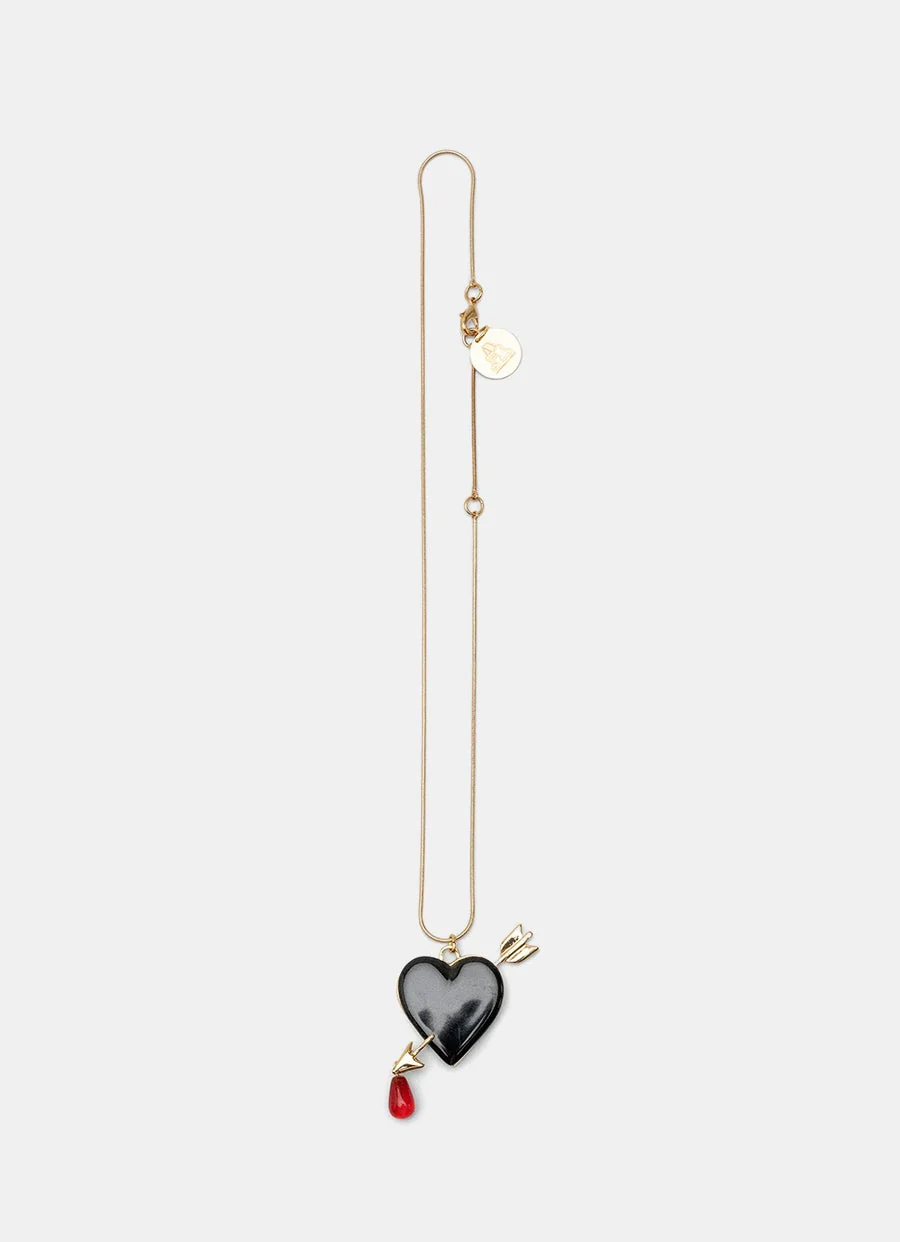 Cadena de Andrés Gallardo en metal chapado en oro de 18k. Corazón de porcelana con gota de vidrio colgante y placa redonda con logo grabado. Longitud ajustable. Hecha en España. Largo total: 48 cm aprox.