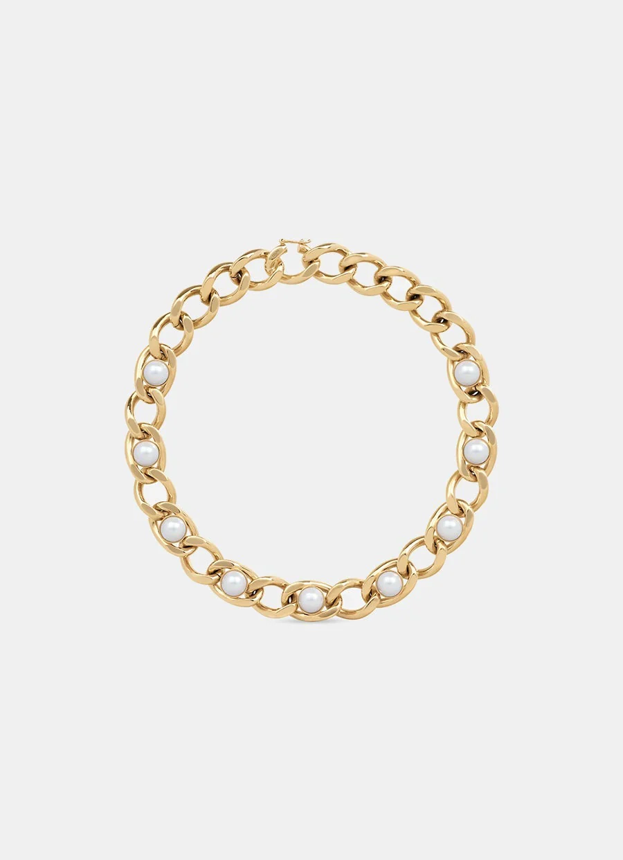 Cadena de Celine de latón con acabado dorado y perlas de resina. Con logo grabado, cierre de eslabón oculto y largo total de 40.5 cm.