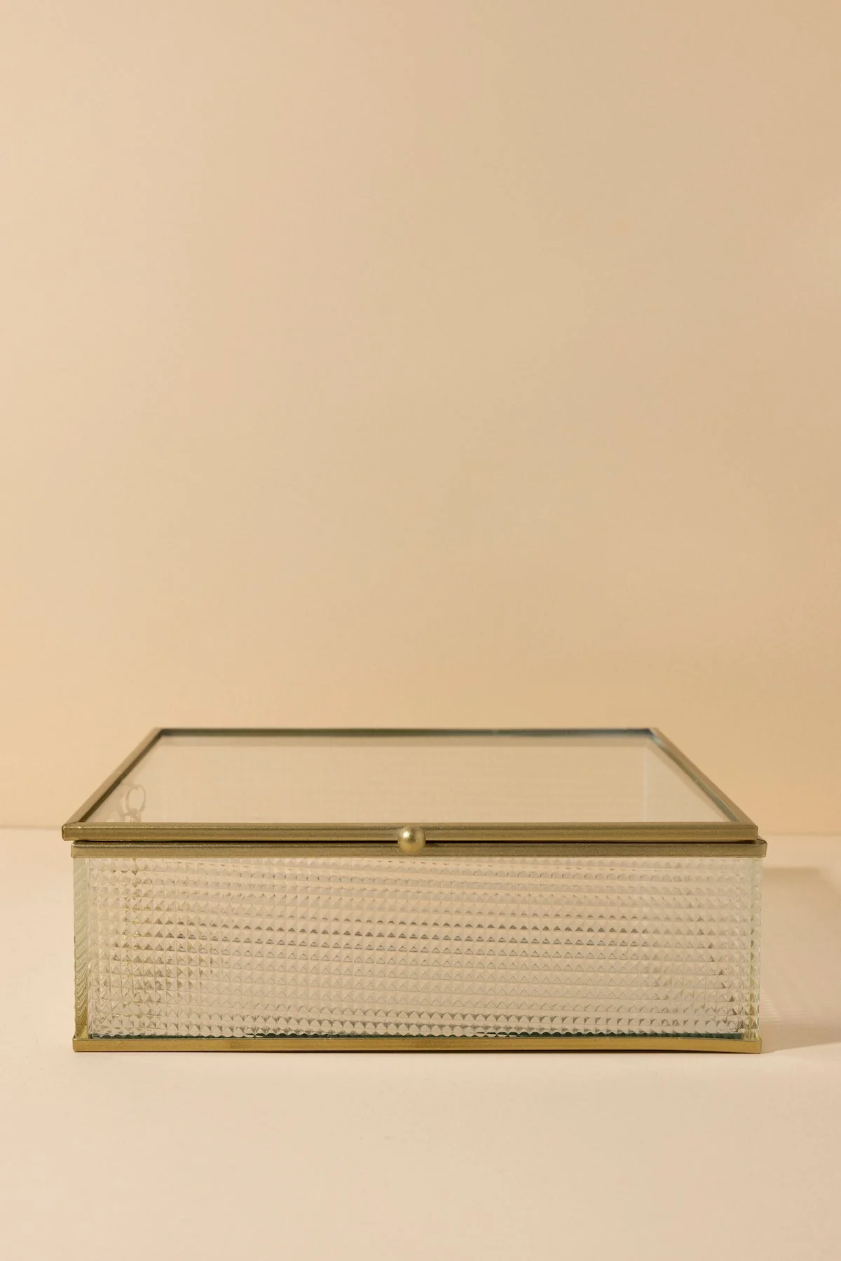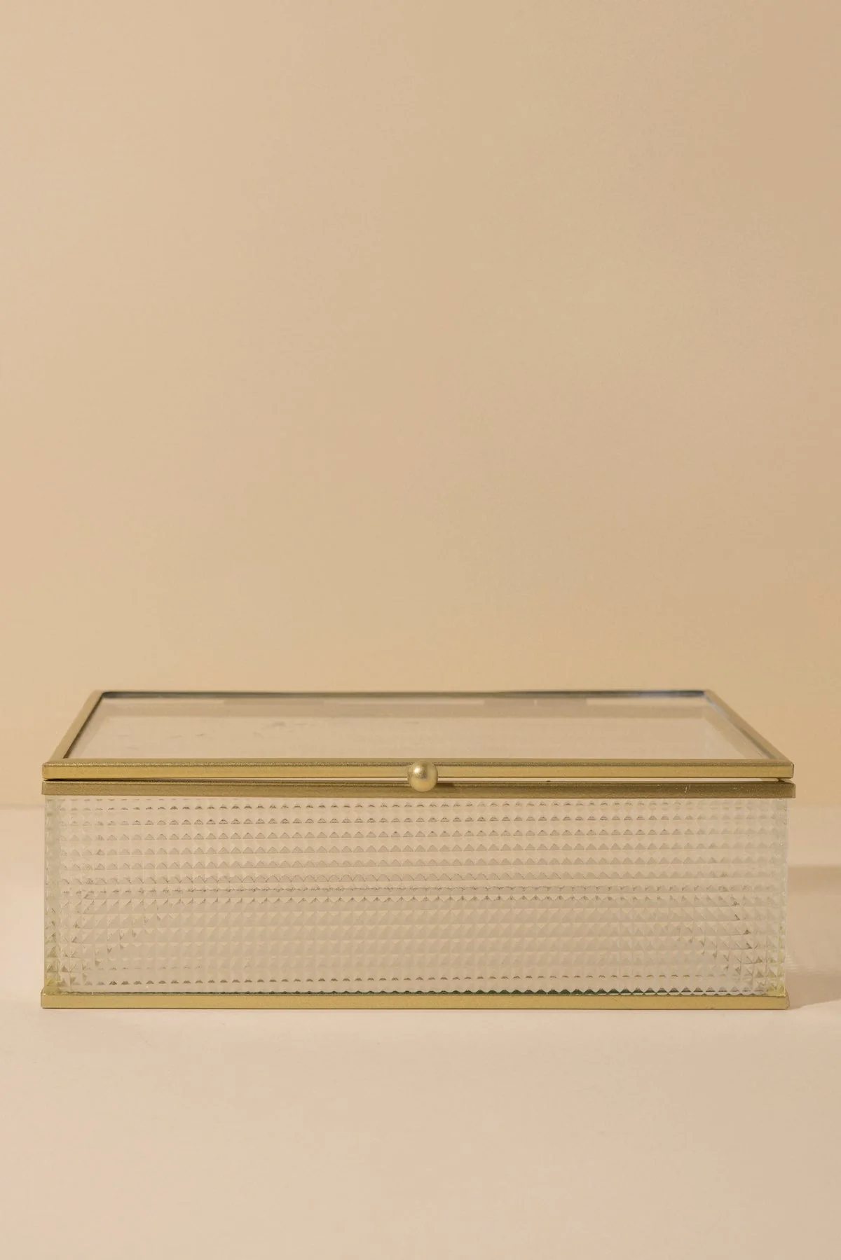 Caja decorativa de cristal con detalles dorados envejecidos.