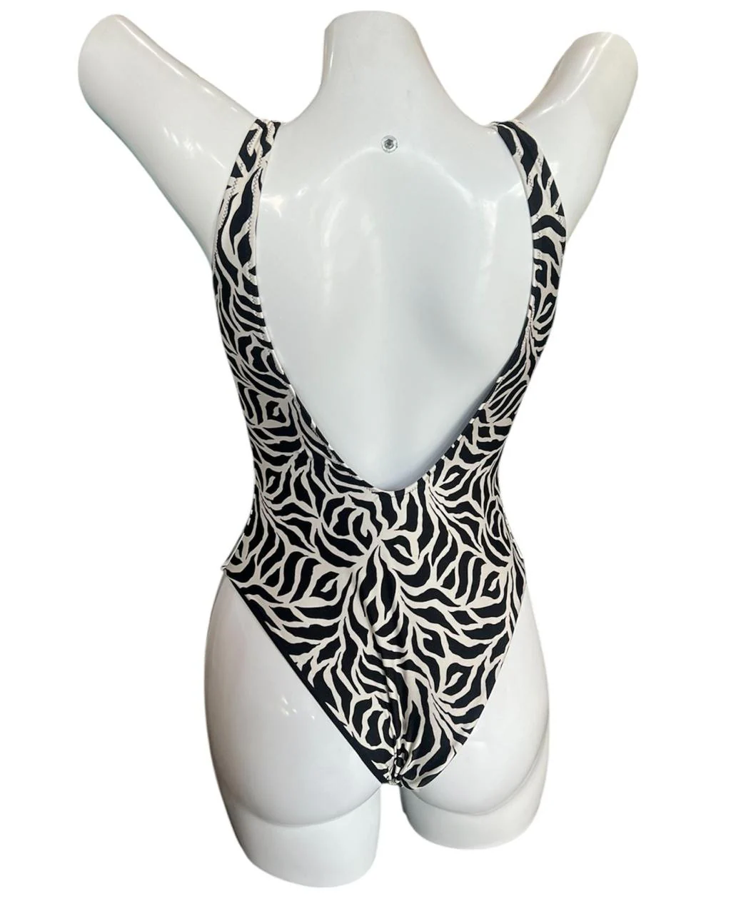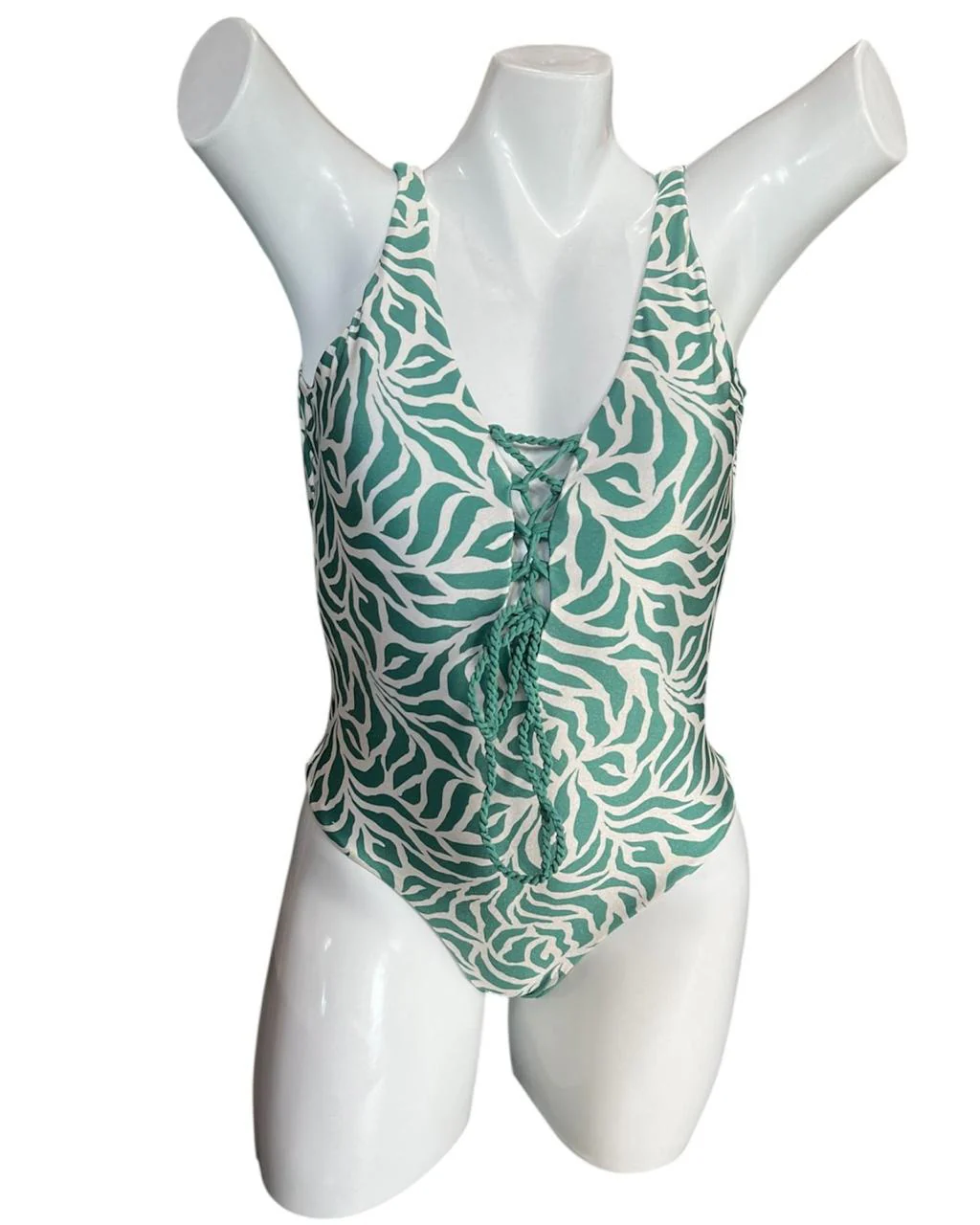Traje de baño entero en animal print. Sus tirantes anchos y escote pronunciado ofrecen soporte y realce, mientras las cintas trenzadas permiten ajustar el busto para un ajuste personalizado. La tela satinada aporta un acabado visual sofisticado, ideal para quienes buscan elegancia y confianza en la playa o la piscina.