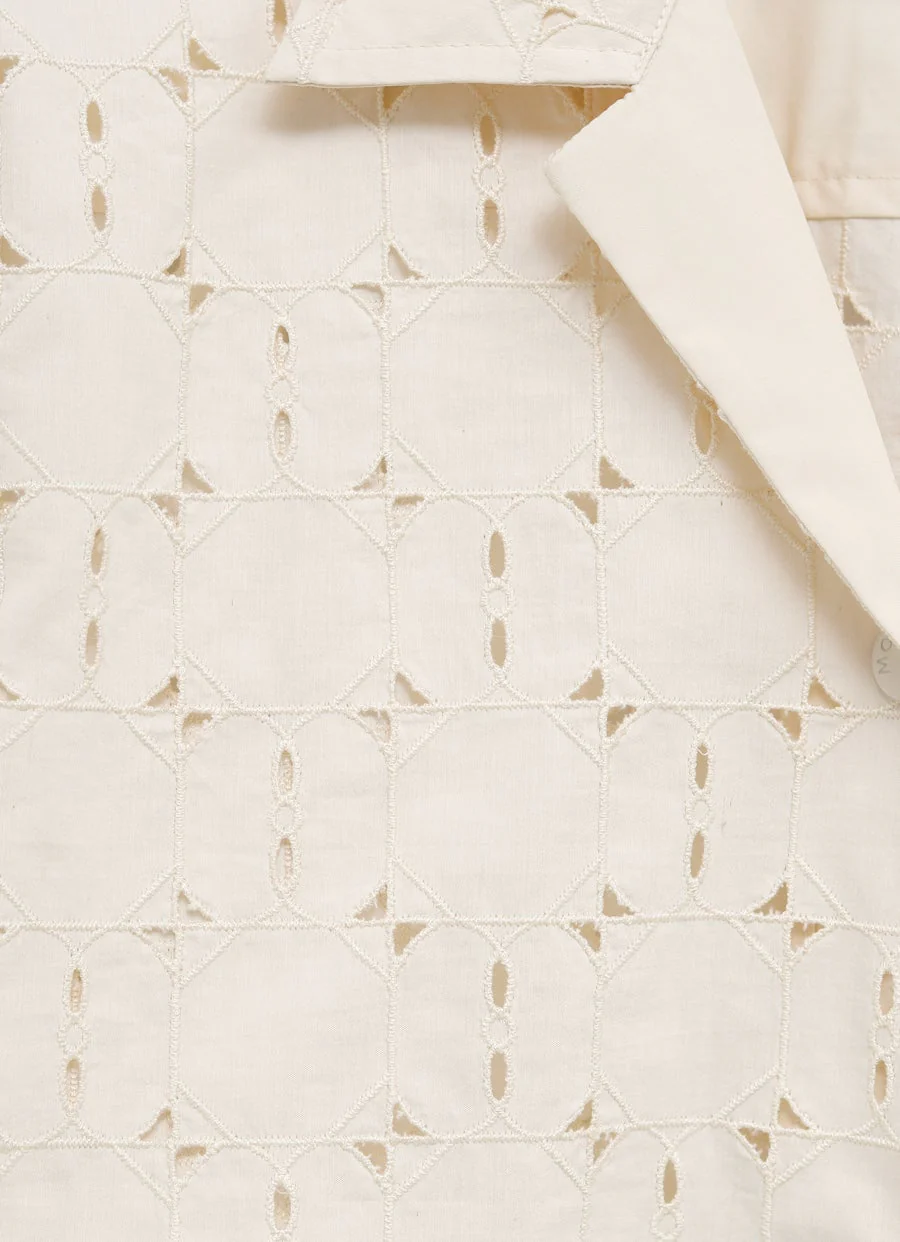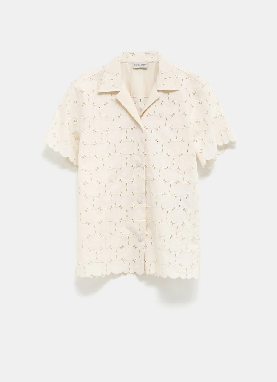 Camisa de Moncler en mezcla de algodón con bordado inglés, forro de popelina orgánica, cuello clásico, manga corta, cierre de botones a presión y parche del logo a tono. Talla normal, elige tu talla habitual. Tallaje italiano para mujer.