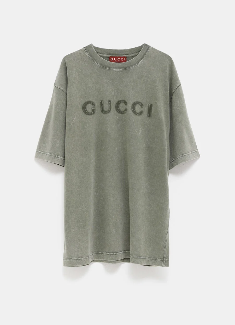Camiseta de Gucci en punto grueso de algodón con logo bordado en el pecho, cuello redondo de canalé, manga corta y corte oversize. Hecha en Italia. Talla normal, elige tu talla habitual. Tallaje estándar para hombre.