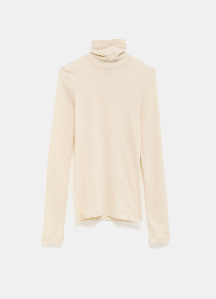 Camiseta Flore Flore en algodón orgánico de canalé ligero y semitransparente, con manga larga, cuello alto y silueta alargada, corte relajado. Hecha en Portugal. Talla normal, elige tu talla habitual. Tallaje estándar para mujer.
