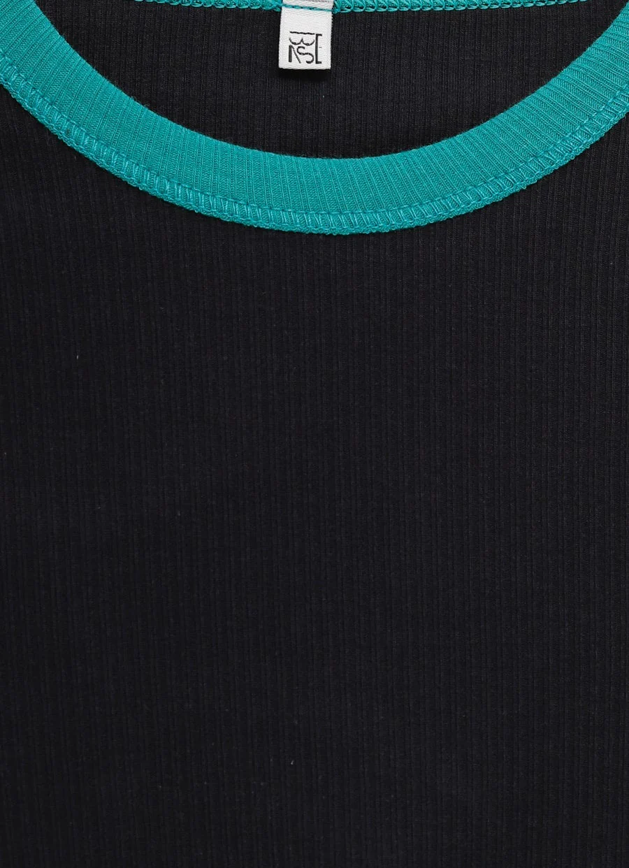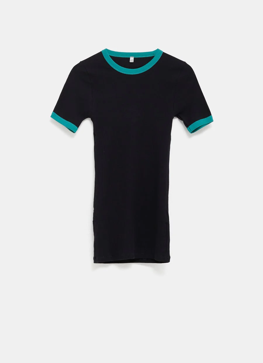 Camiseta de Baserange en punto de canalé con elásticos en contraste, cuello redondo y corte ajustado. Hecha en Portugal. Talla pequeña, elije una talla más a tu talla habitual. Tallaje estándar.