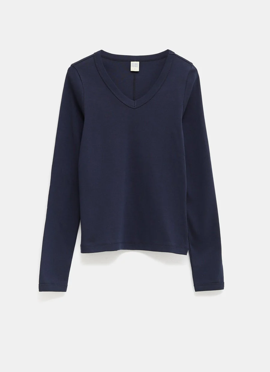 Camiseta Flore Flore en algodón orgánico suave de gramaje medio. Con manga larga, cuello de pico y remates elásticos. Hecha en Portugal. Corte ajustado, si dudas entre dos tallas, recomendamos elegir una talla más. Tallaje estándar para mujer.