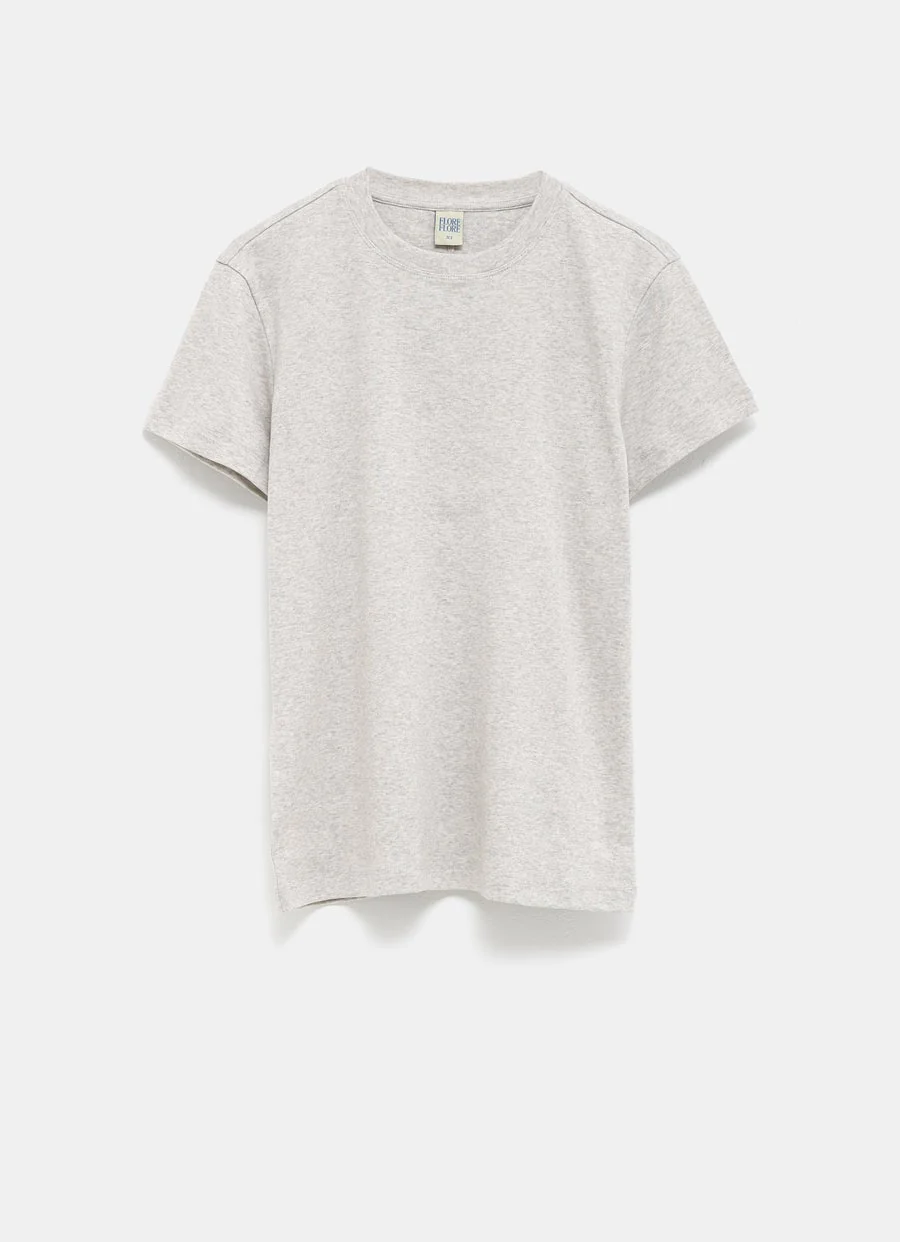Camiseta Flore Flore en algodón orgánico de canalé, con manga corta, cuello redondo y costura en la espalda. Corte relajado. Hecha en Portugal. Talla normal, elige tu talla habitual. Tallaje estándar para mujer.