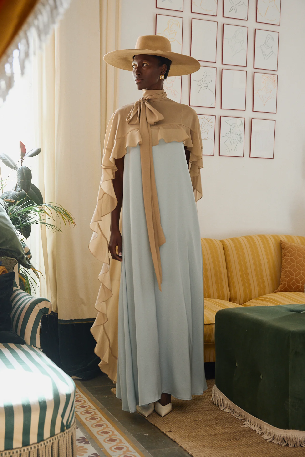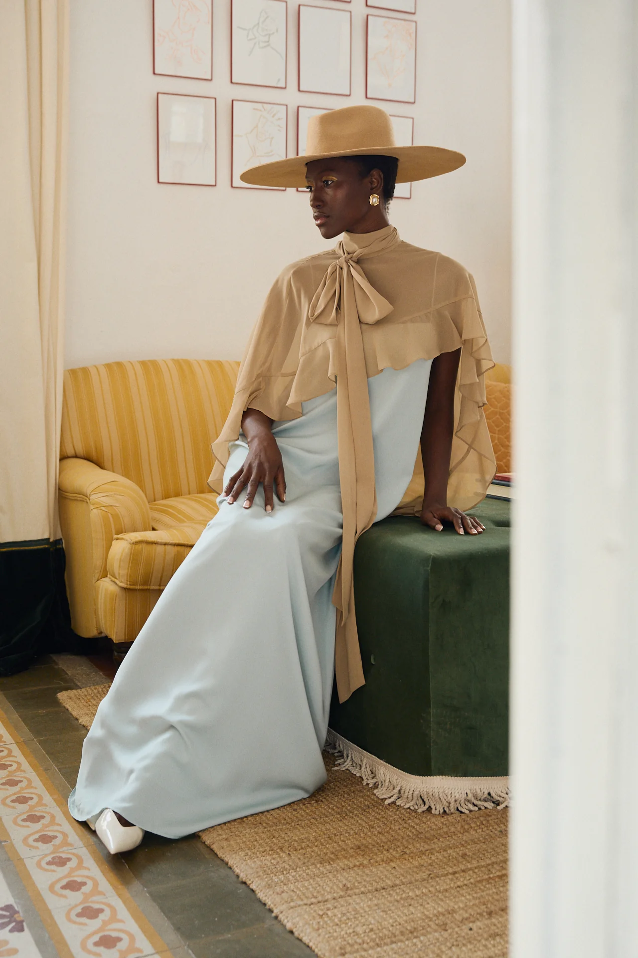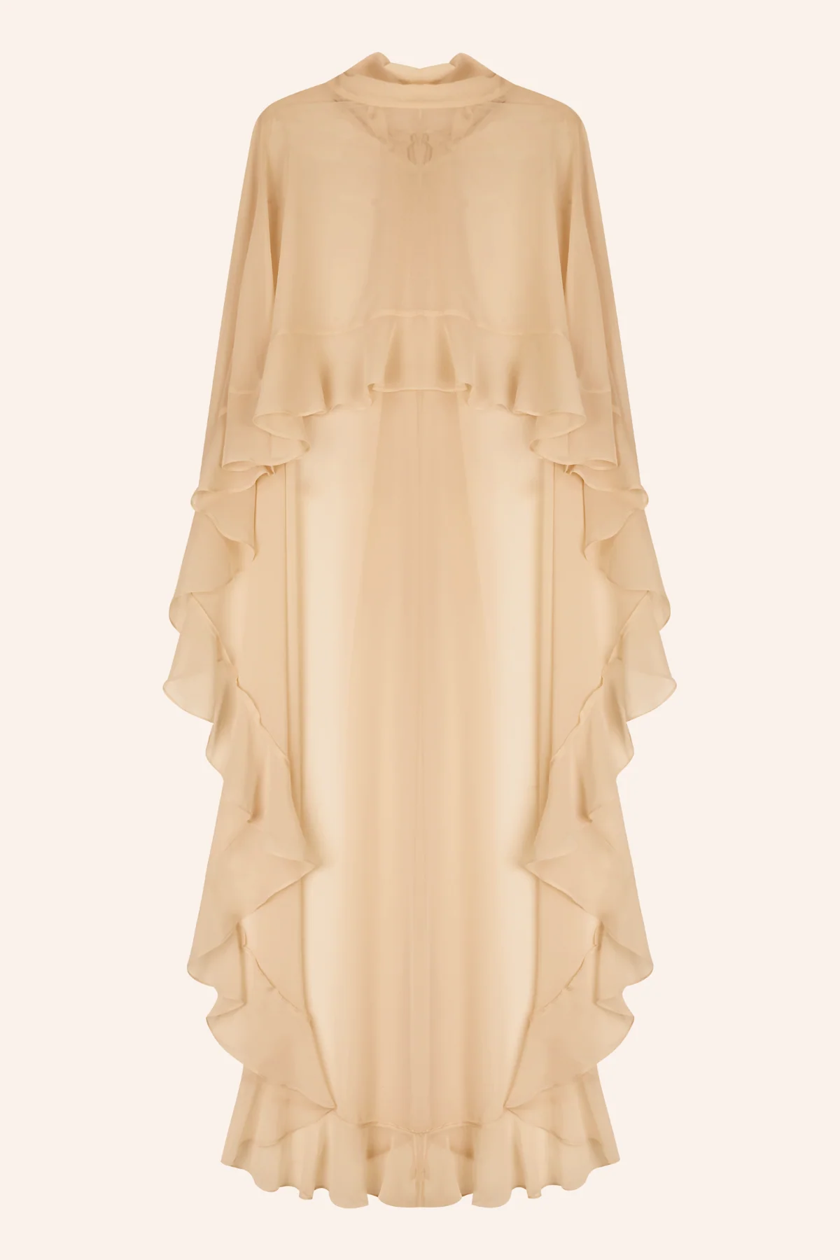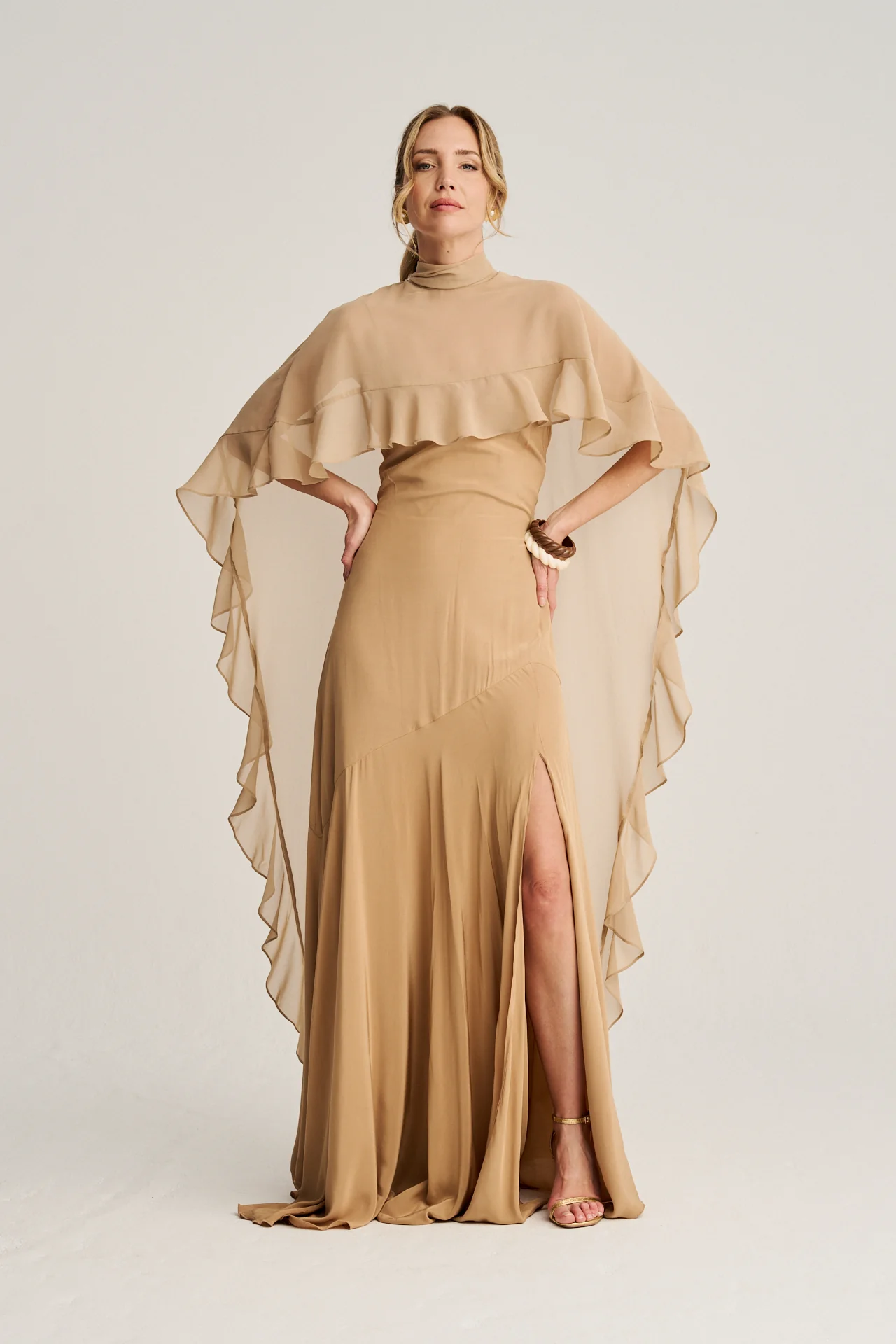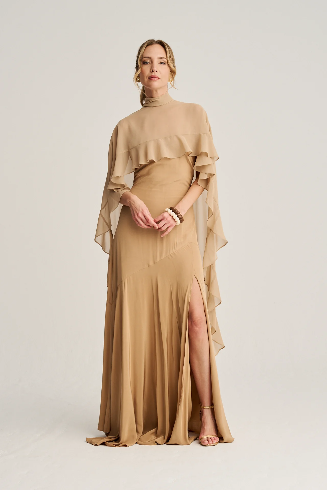Esta capa de gasa color toffee o nude es el accesorio perfecto para invitadas que buscan elegancia y sofisticación en sus eventos especiales. Con un diseño con cuello alto, esta capa se destaca por su lazada extra larga con volante, que aporta un toque de feminidad y estilo único. El largo asimétrico de la capa, junto con su tejido de gasa de alta calidad, ofrece un movimiento fluido que añade dinamismo a cualquier conjunto. Ideal para bodas, fiestas elegantes o eventos formales, esta capa es perfecta para invitadas de boda que desean resaltar su look. Su versatilidad permite combinarla tanto con atuendos formales como más relajados, mientras que su colores toffee proporciona un toque cálido y sofisticado, perfecto para la temporada de primavera o otoño.