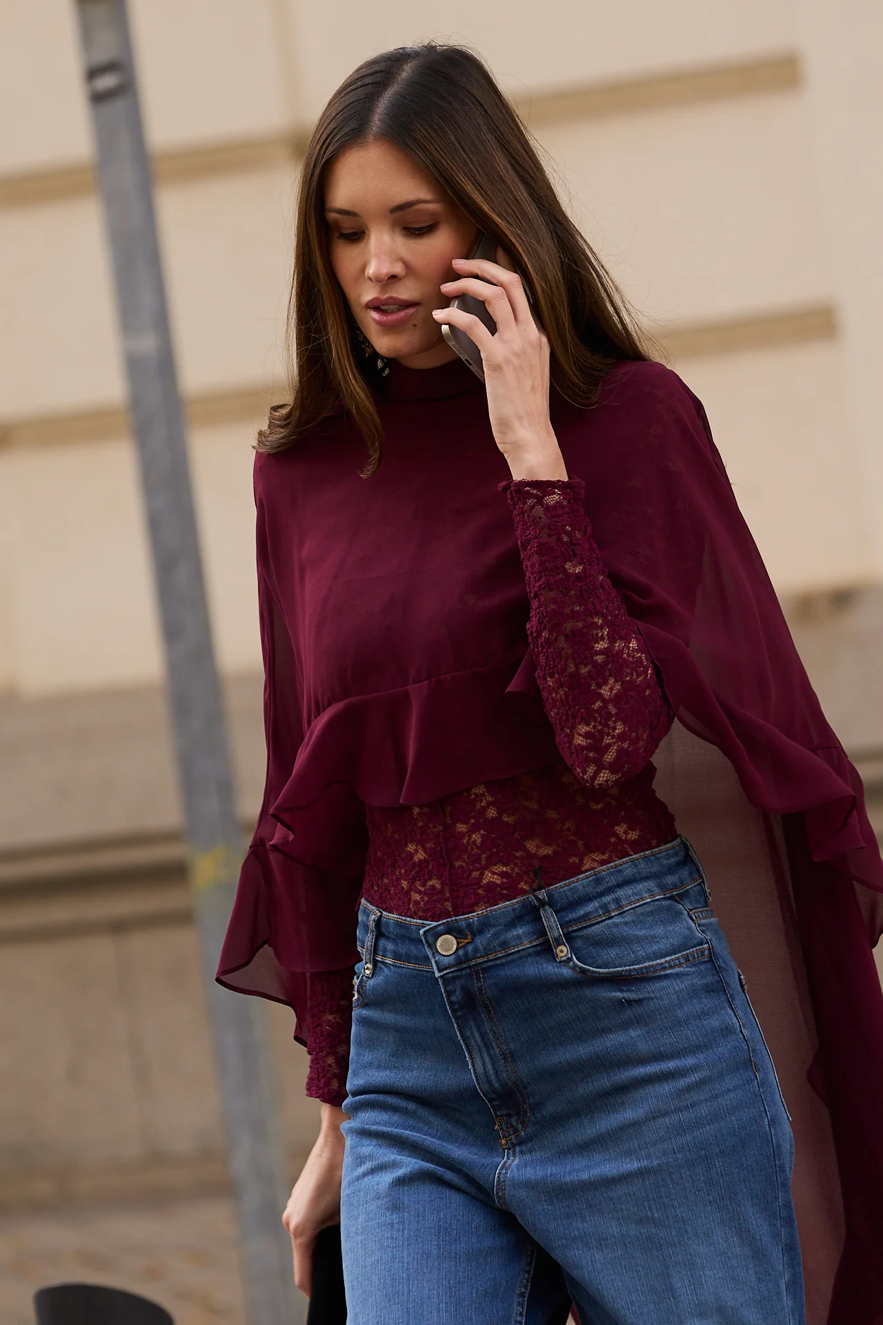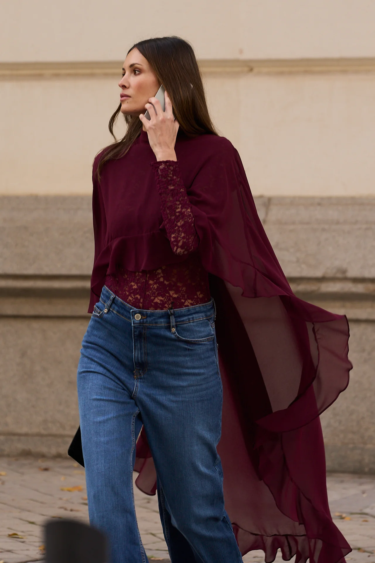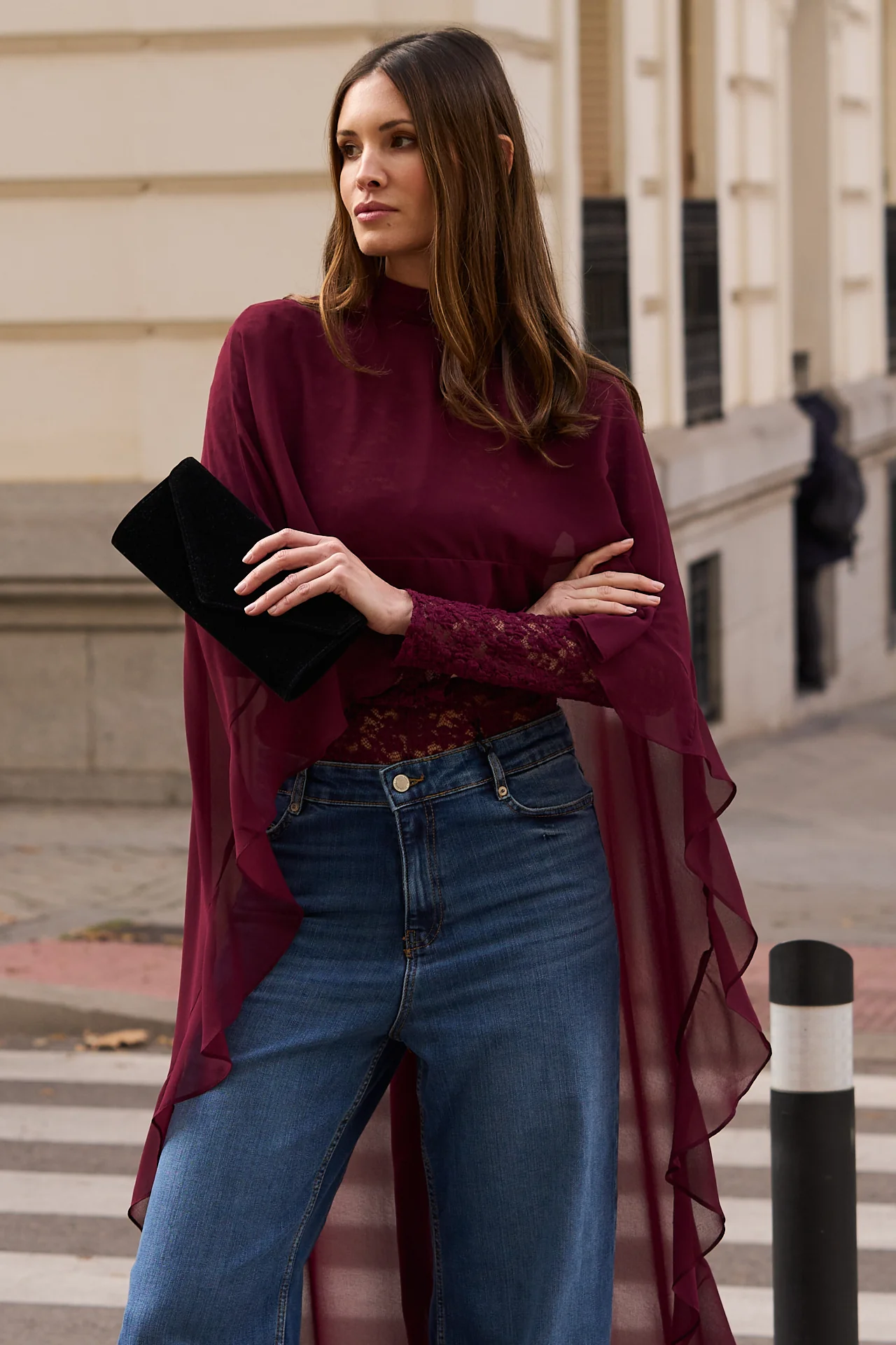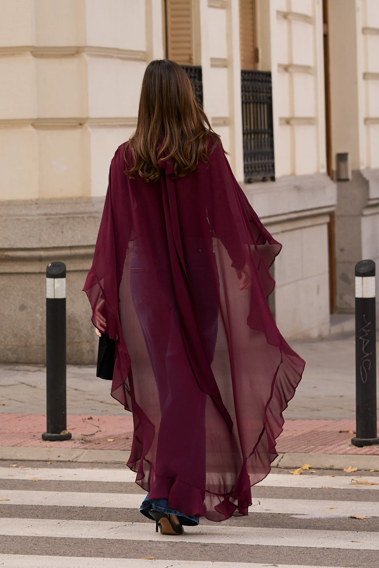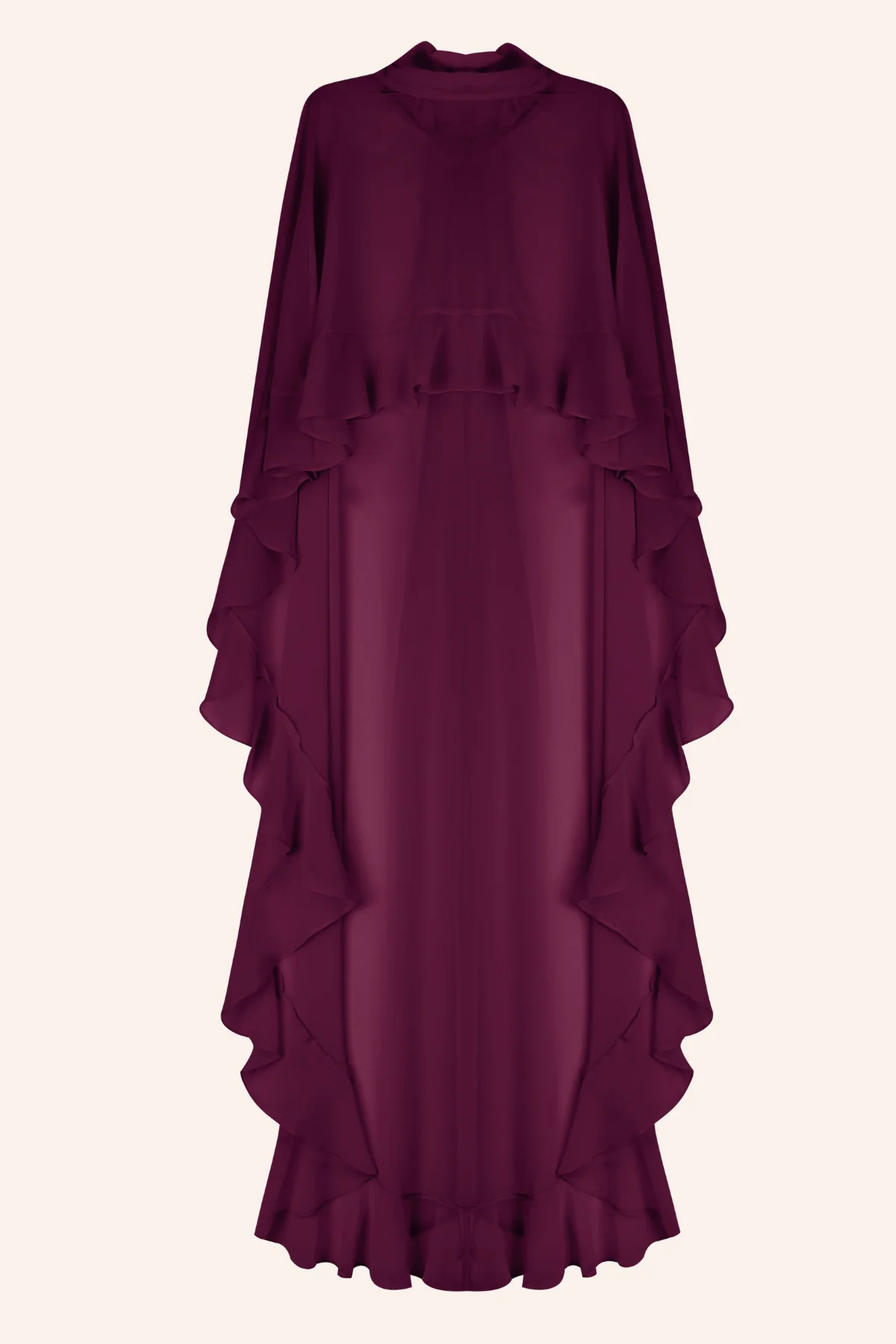 Esta capa de gasa en burdeos, tambi茅n llamado granate, es el accesorio perfecto para invitadas que buscan elegancia con un toque de intensidad crom谩tica. Su dise帽o con cuello alto se completa con una lazada extra larga rematada en volante, un detalle sofisticado y femenino que realza el conjunto.
