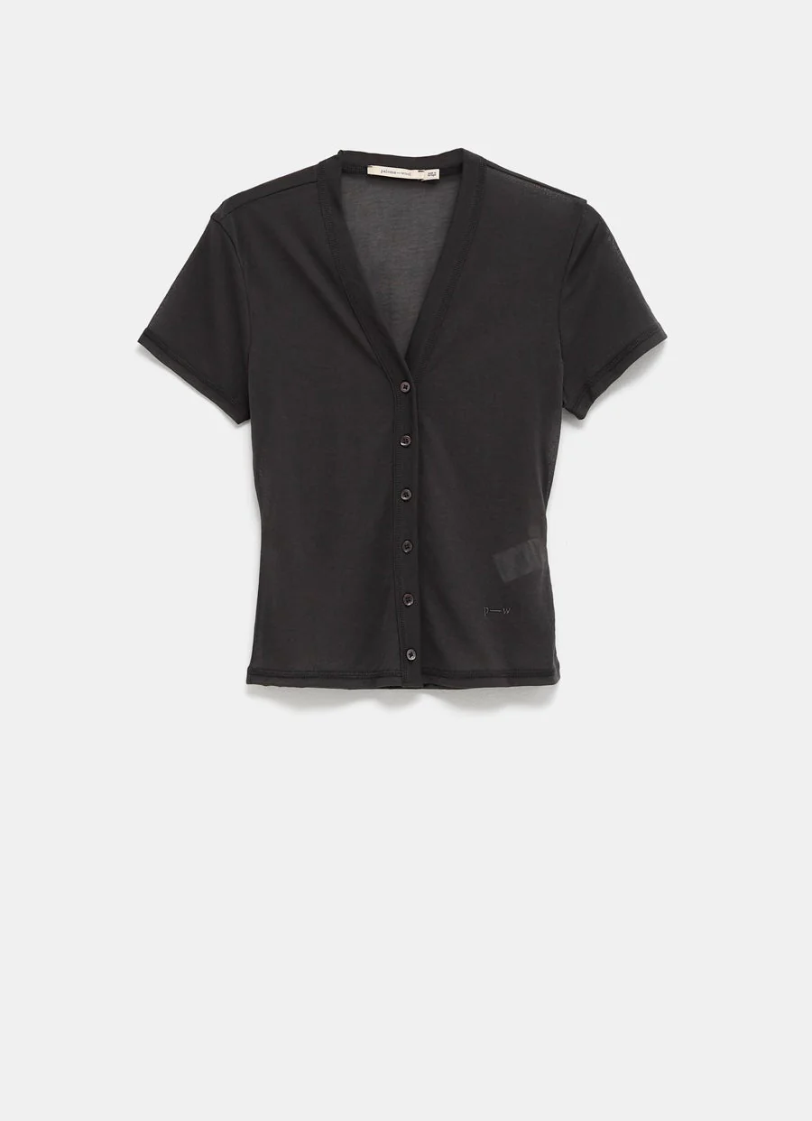 Cárdigan de Paloma Wool en tejido semitransparente. Con cuello de pico, cierre con botones e iniciales bordadas. Hecho en Portugal. Talla normal, elige tu talla habitual. Tallaje estándar.