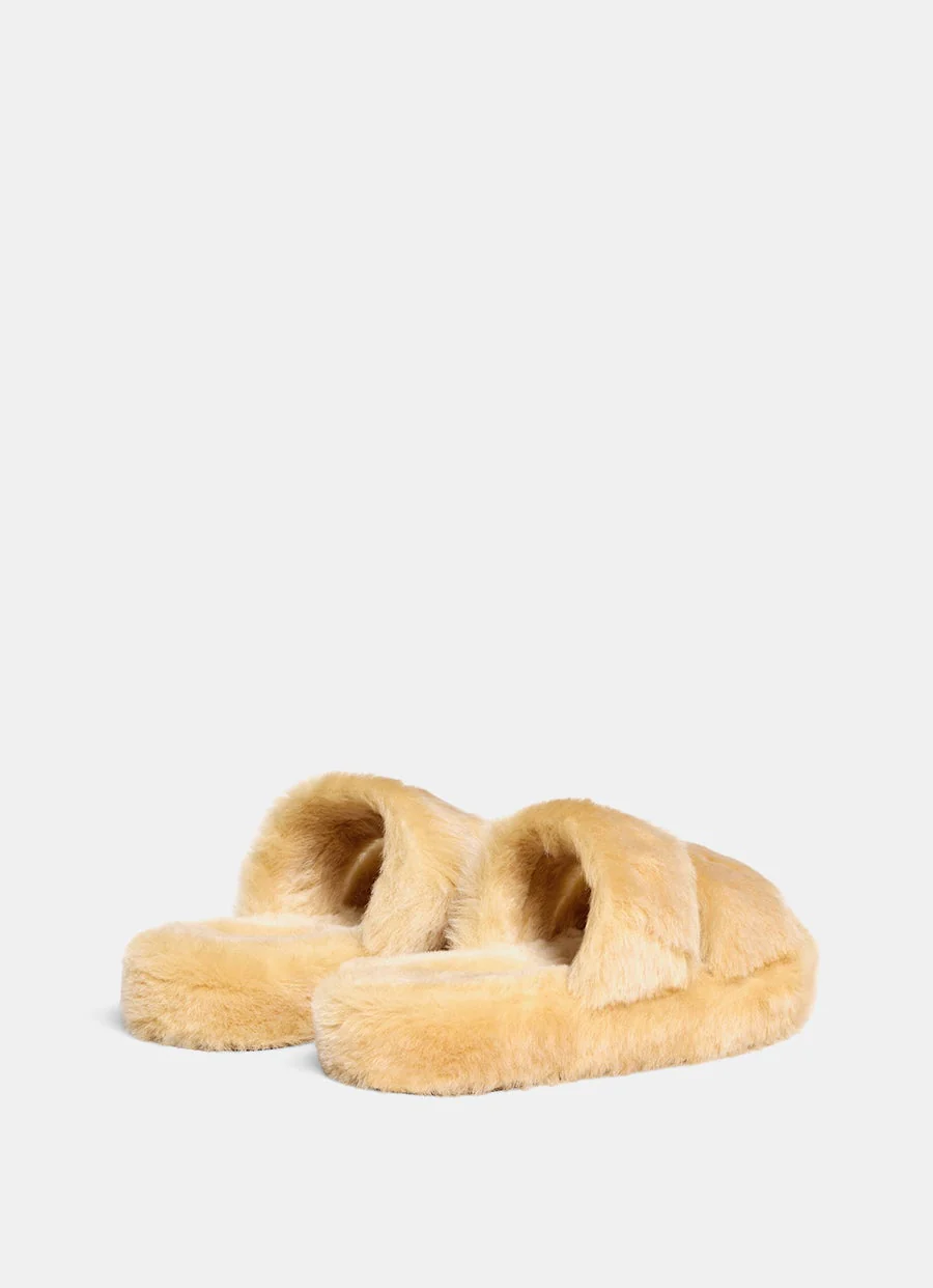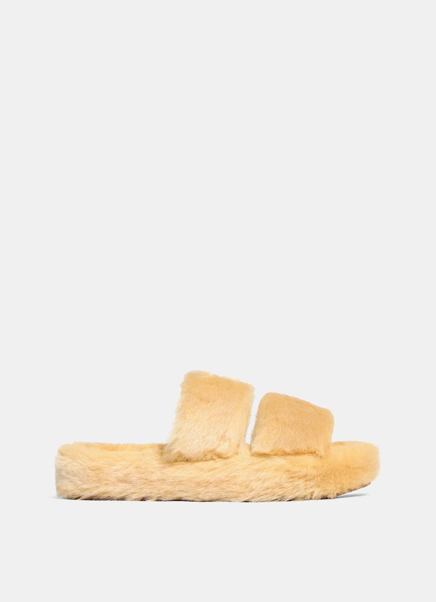 Chancla de Celine en pelo de borrego. Con dos tiras superiores, detalle Triomphe de cuero, puntera redonda, plantilla acolchada de borreguito y suela de goma antideslizante. Hecha en Italia. Talla normal elige tu talla habitual. Tallaje italiano para mujer.