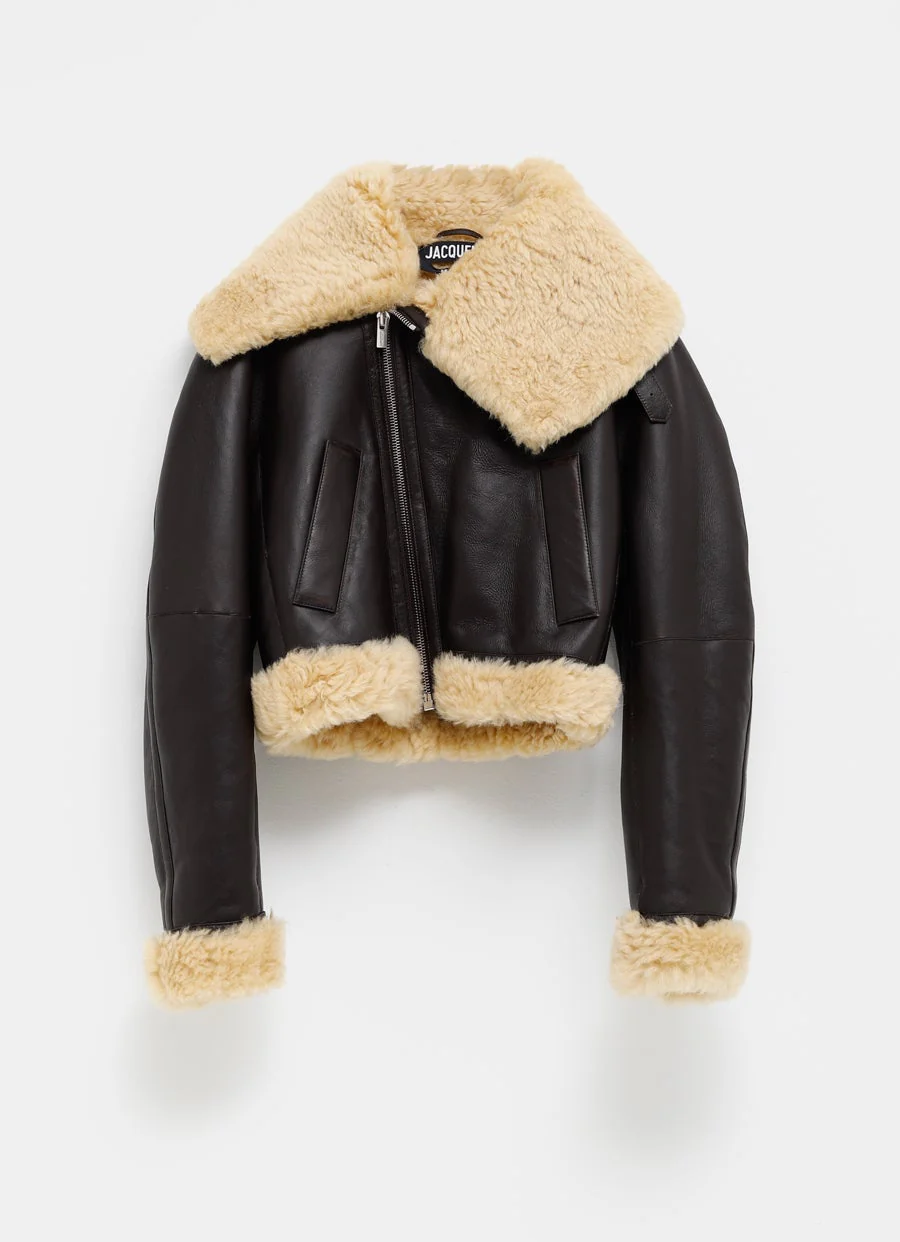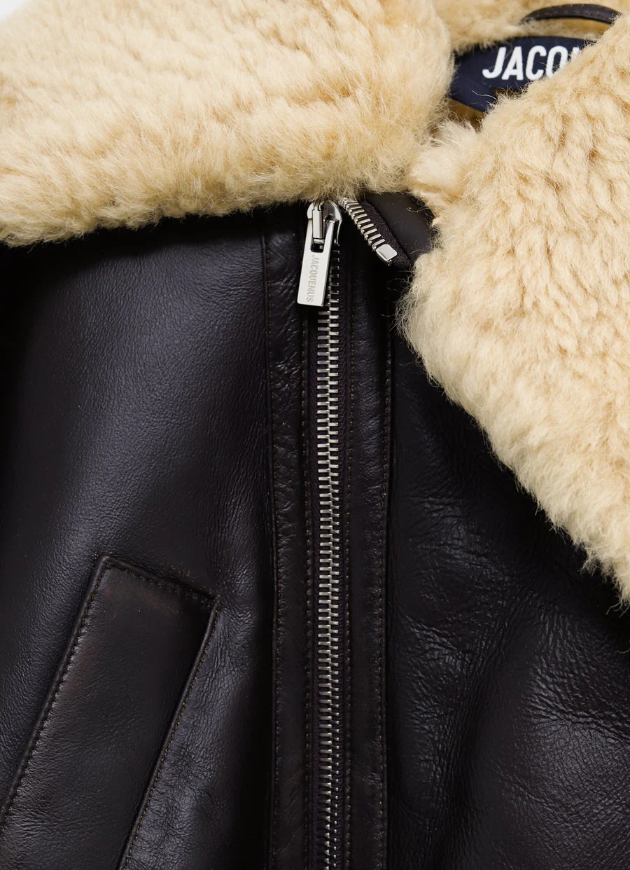 Chaqueta de aviador de Jacquemus en piel ovina esquilada de cordero de doble cara y cuello de piel de borrego. Cierre de cremallera inclinada, bolsillos frontales, puños y dobladillo con ribetes de piel de borrego, y correa ajustable en el cuello. Corte recto. Talla normal, elige tu talla habitual. Tallaje UE para mujer.