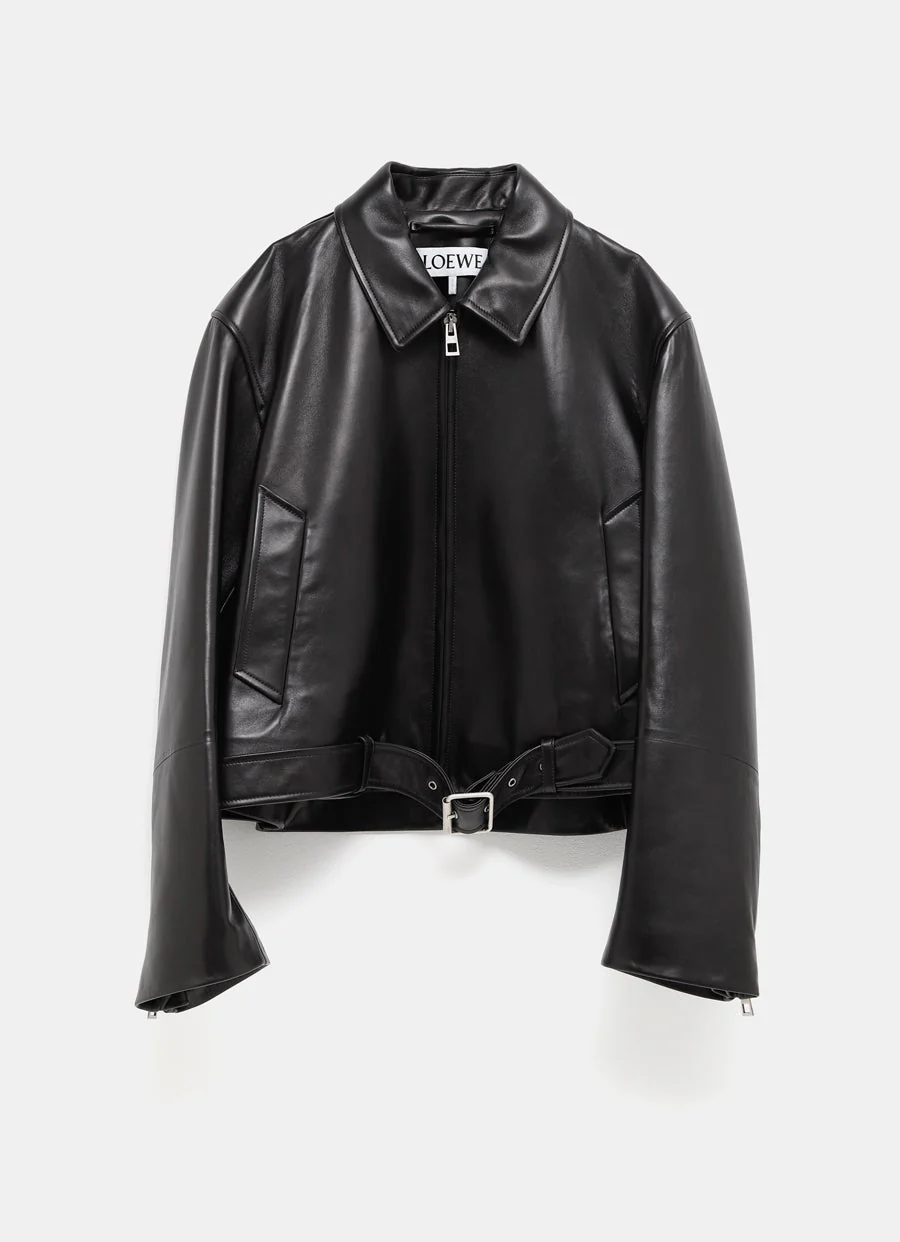 Chaqueta de Loewe en piel de cordero con cierre de cremallera frontal, bolsillos laterales, cinturón con hebilla y forro de viscosa. Largo cropped y corte regular. Hecha en España. Talla normal, elige tu talla habitual. Tallaje francés para hombre.