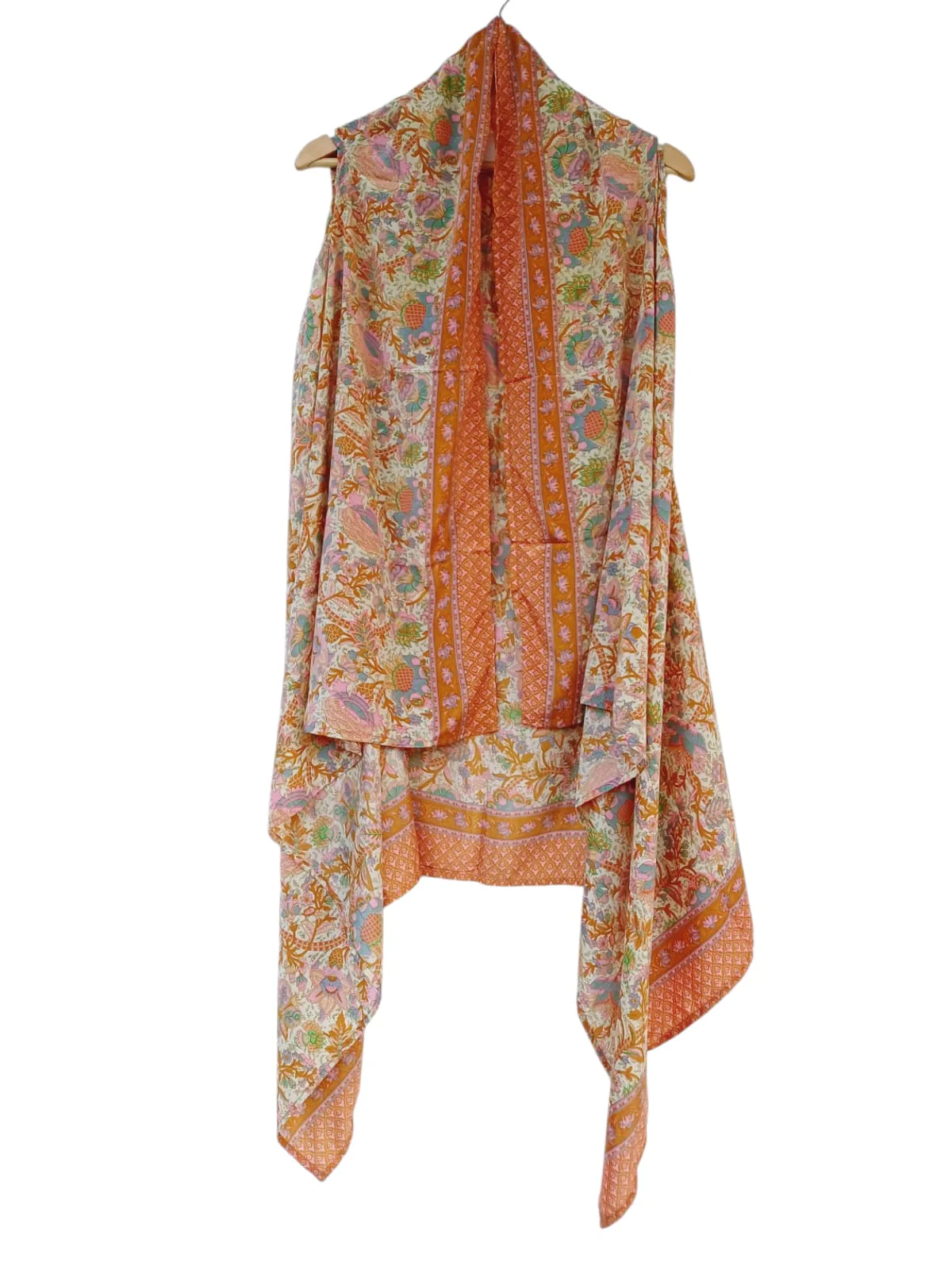 Chaleco 65% algodón 30% poliéster, color crema y beige, manga con aplicación macramé flecos.