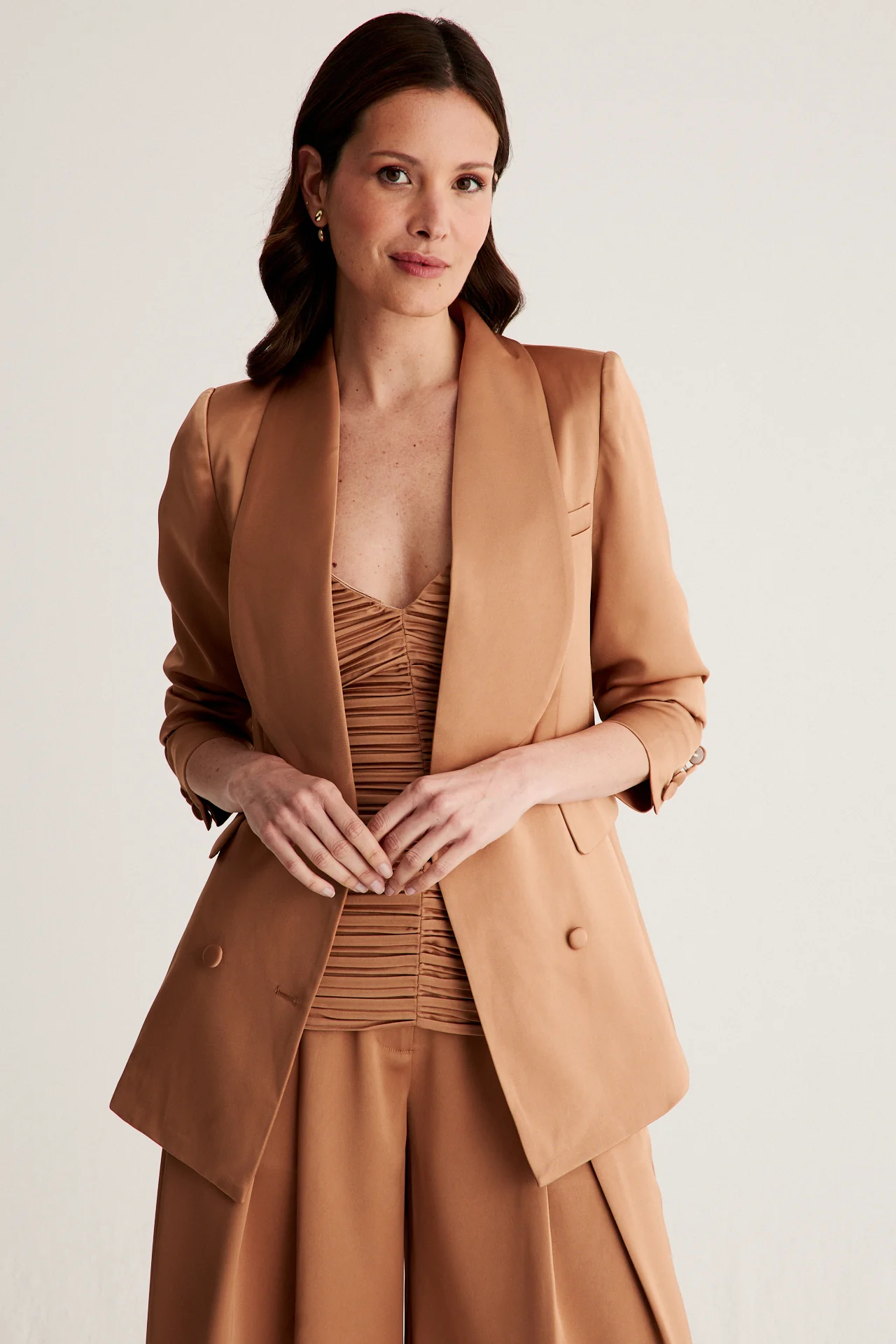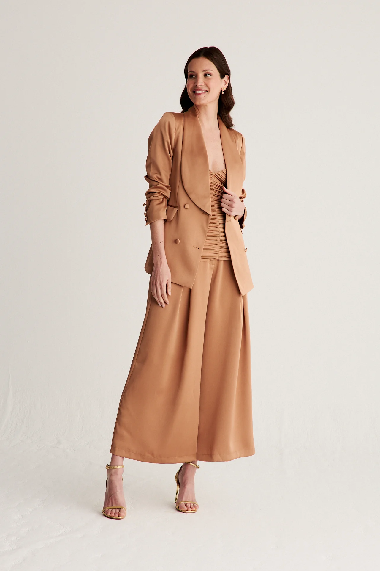 Chaqueta cruzada en mikado color caramelo, una prenda sofisticada y con car谩cter que eleva cualquier estilismo. Su dise帽o con solapas curvadas y botones forrados en el mismo tejido aporta un aire distinguido y elegante, perfecto para construir un look con personalidad.