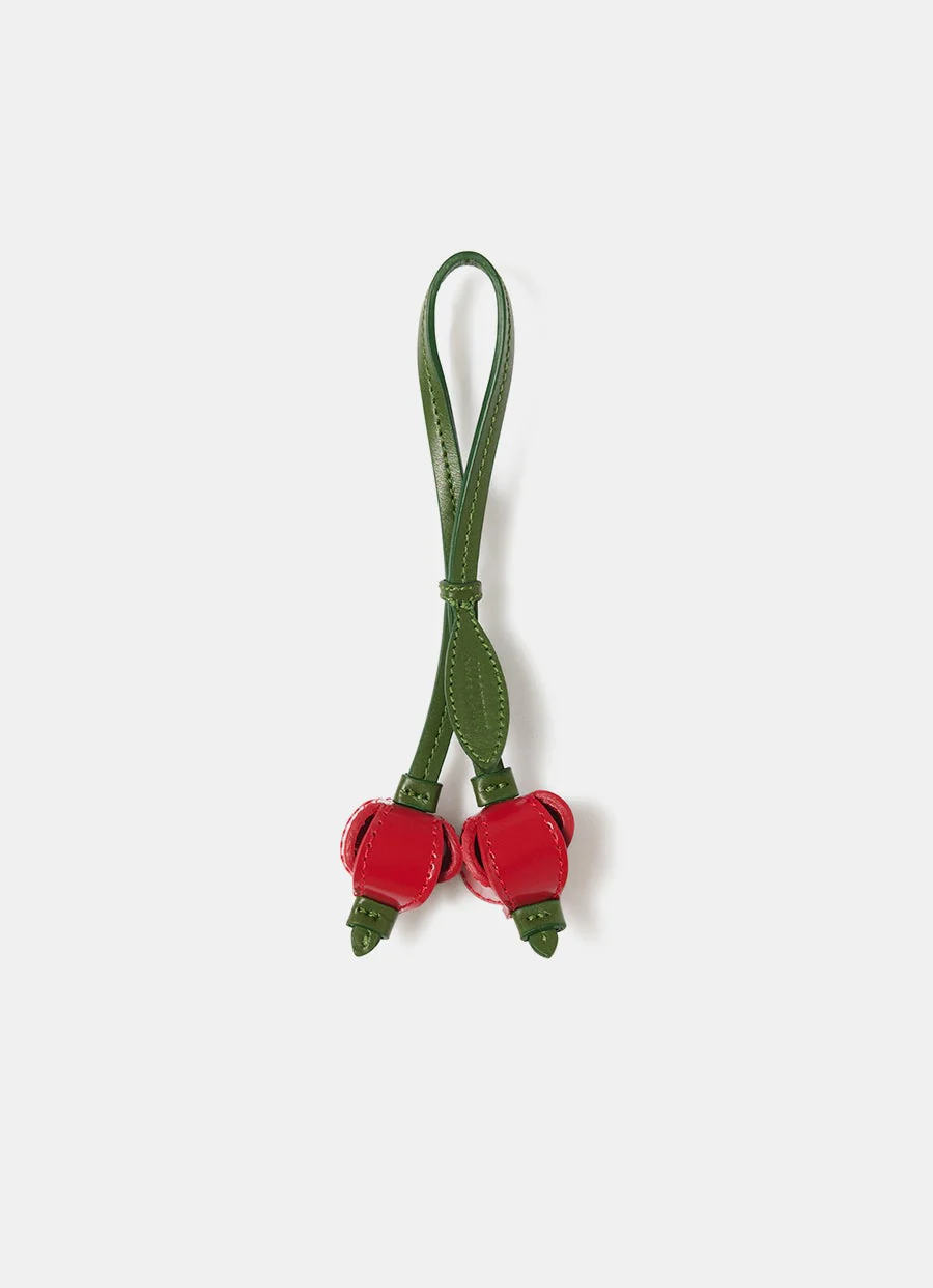 Amuleto de Jacquemus en cuero suave con forma de cerezas, correa de 13 cm, detalle de hoja y logo grabado. Hecho en Italia. Tamaño: 8 x 6.5 x 3 cm aprox.