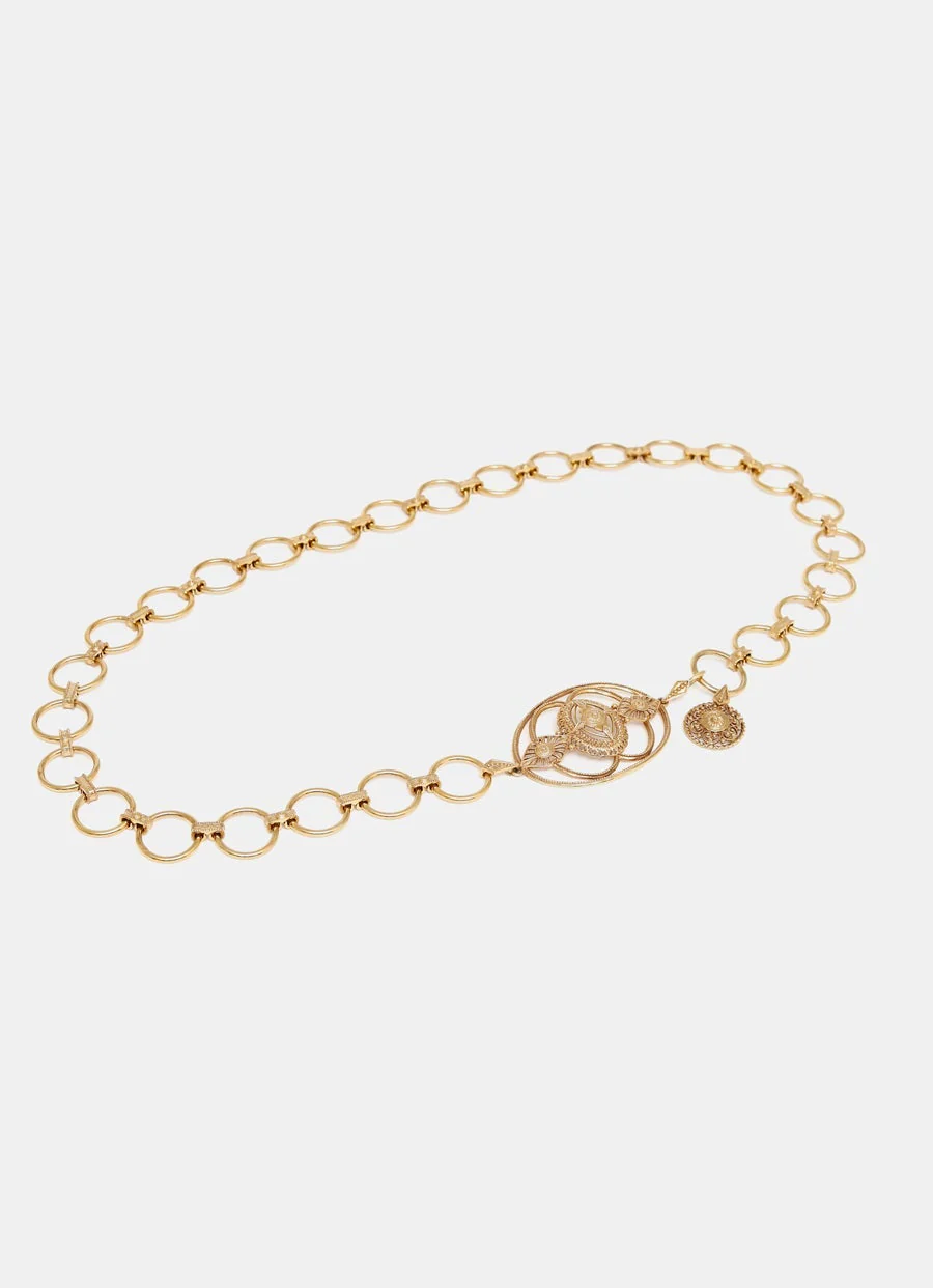 Cintur贸n cadena de Chlo茅 en lat贸n dorado con detalle de amuleto, logo grabado, cierre de gancho y longitud ajustable. Hecho en Italia. Largo total: 105 cm. Para llevar en la cintura o en las caderas.
