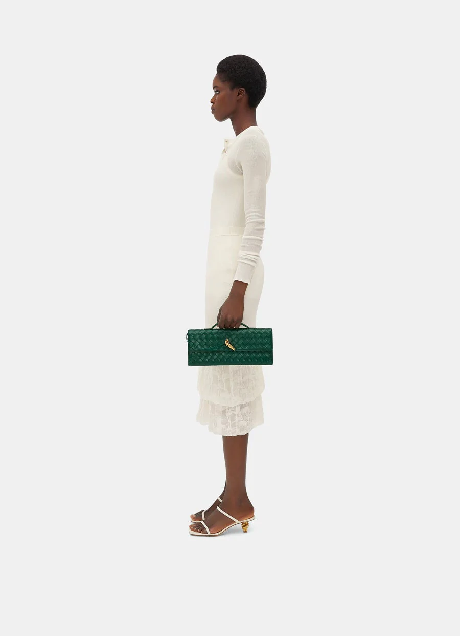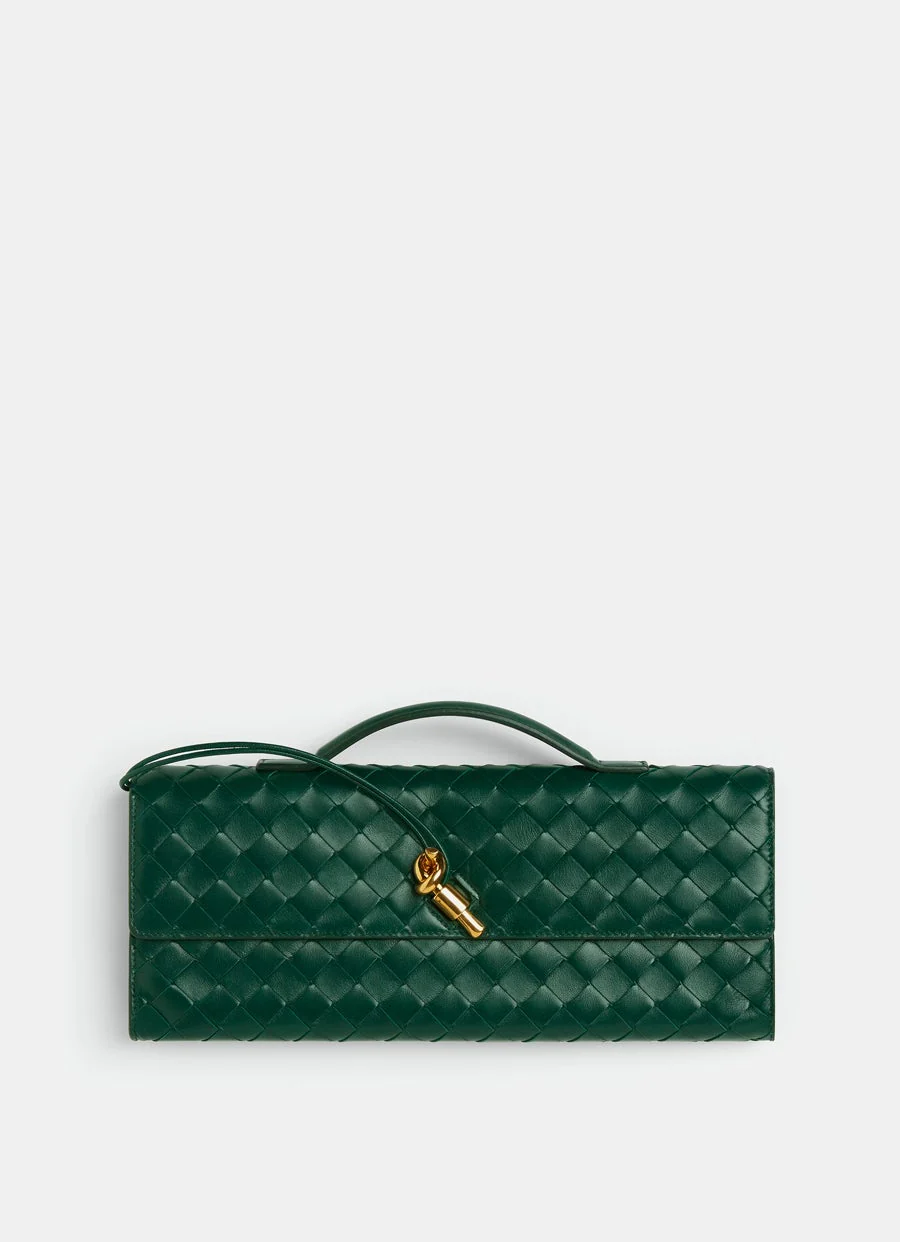 Clutch de Bottega Veneta en piel flexible con motivo Intrecciato. Cierre de pasador metálico dorado, asa superior, seis ranuras para tarjetas, bolsillo adicional y forro de piel de becerro. Hecho en Italia. Dimensiones: 13 x 31 x 3 cm.