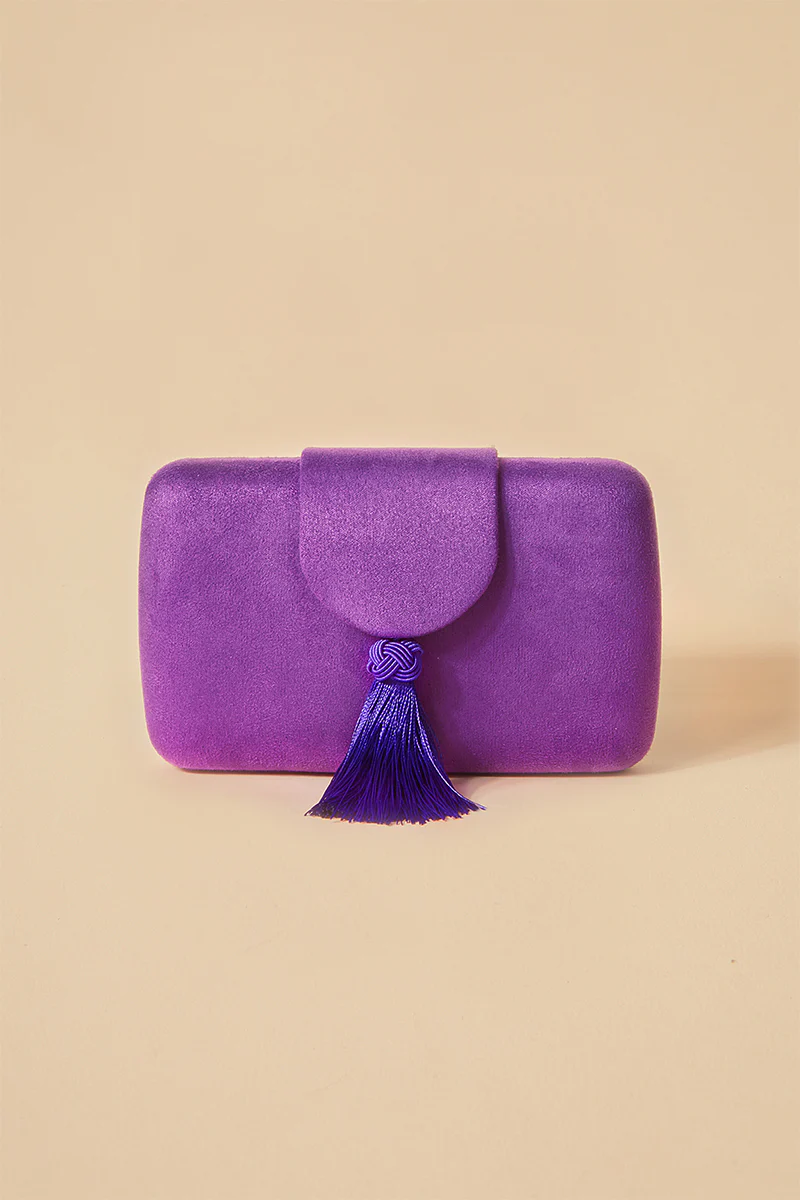Bolso de fiesta para invitadas tipo cajita rectangular con bordes redondeados realizado en simil antelina con cierre de pompon en cordon coordinado.