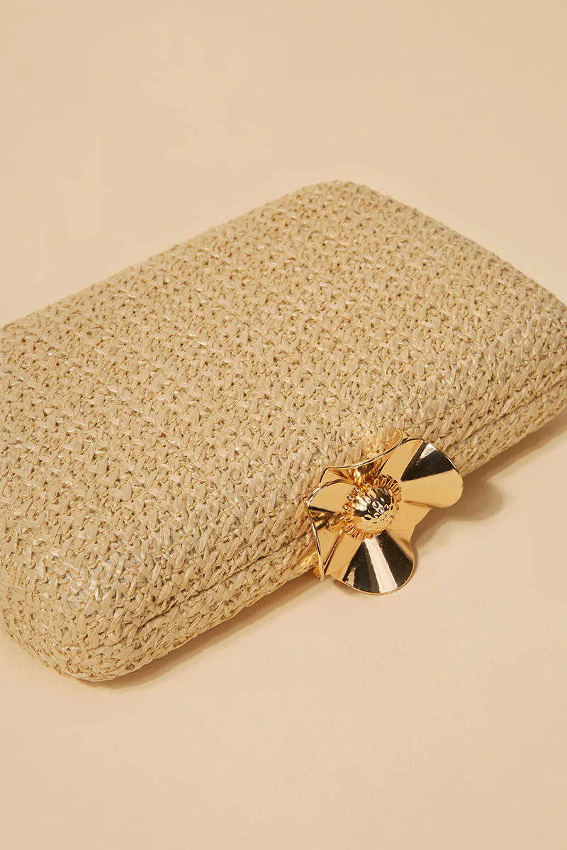 Bolso de fiesta para invitadas tipo cajita rectangular realizado en rafia trenzada con cierre metálico.