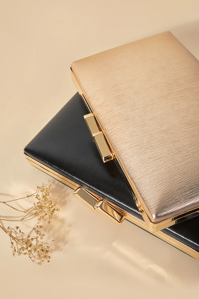 Clutch r铆gido en tono dorado champagne, ideal para ocasiones formales y eventos especiales. Su dise帽o minimalista y elegante destaca por su textura sutilmente granulada, que le aporta un toque moderno y sofisticado. El cierre met谩lico a帽ade un elemento pr谩ctico y seguro para mantener tus pertenencias a salvo. Perfecto para combinar con vestidos de noche o trajes de c贸ctel, este bolso de mano es el accesorio ideal para elevar cualquier look con un toque de glamour discreto.