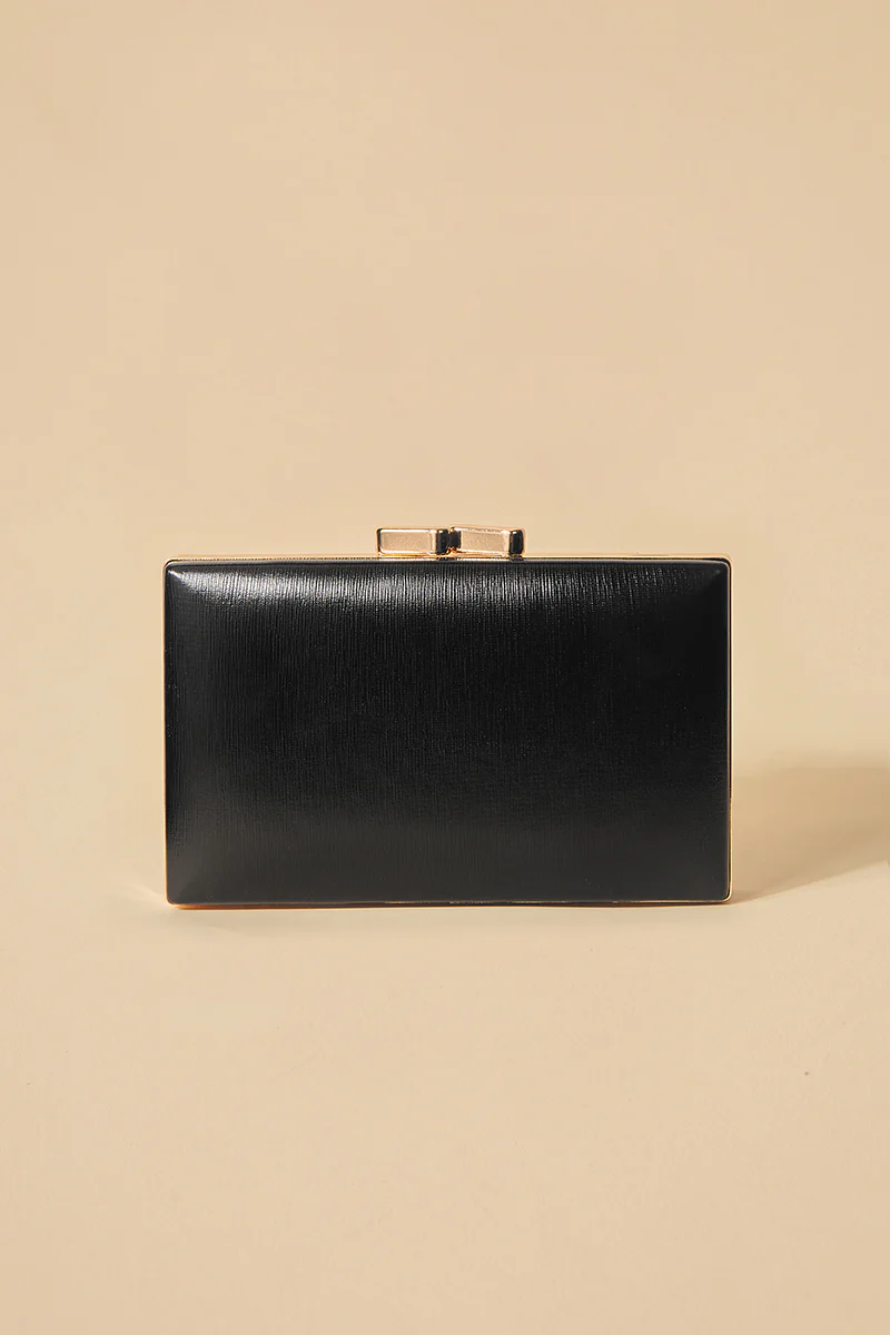 Clutch r铆gido en tono negro, ideal para ocasiones formales y eventos especiales. Su dise帽o minimalista y elegante destaca por su textura sutilmente granulada, que le aporta un toque moderno y sofisticado. El cierre met谩lico a帽ade un elemento pr谩ctico y seguro para mantener tus pertenencias a salvo. Perfecto para combinar con vestidos de noche o trajes de c贸ctel, este bolso de mano es el accesorio ideal para elevar cualquier look con un toque de glamour discreto.