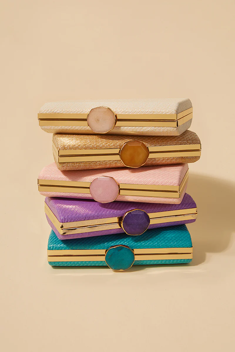 Bolso de fiesta para invitadas tipo caja rectangular realizado en rafia trenzada con cierre metal con pieza decorativa.