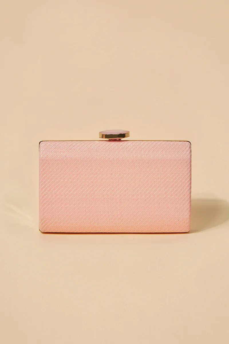Bolso de fiesta para invitadas tipo caja rectangular realizado en rafia trenzada con cierre metal con pieza decorativa.