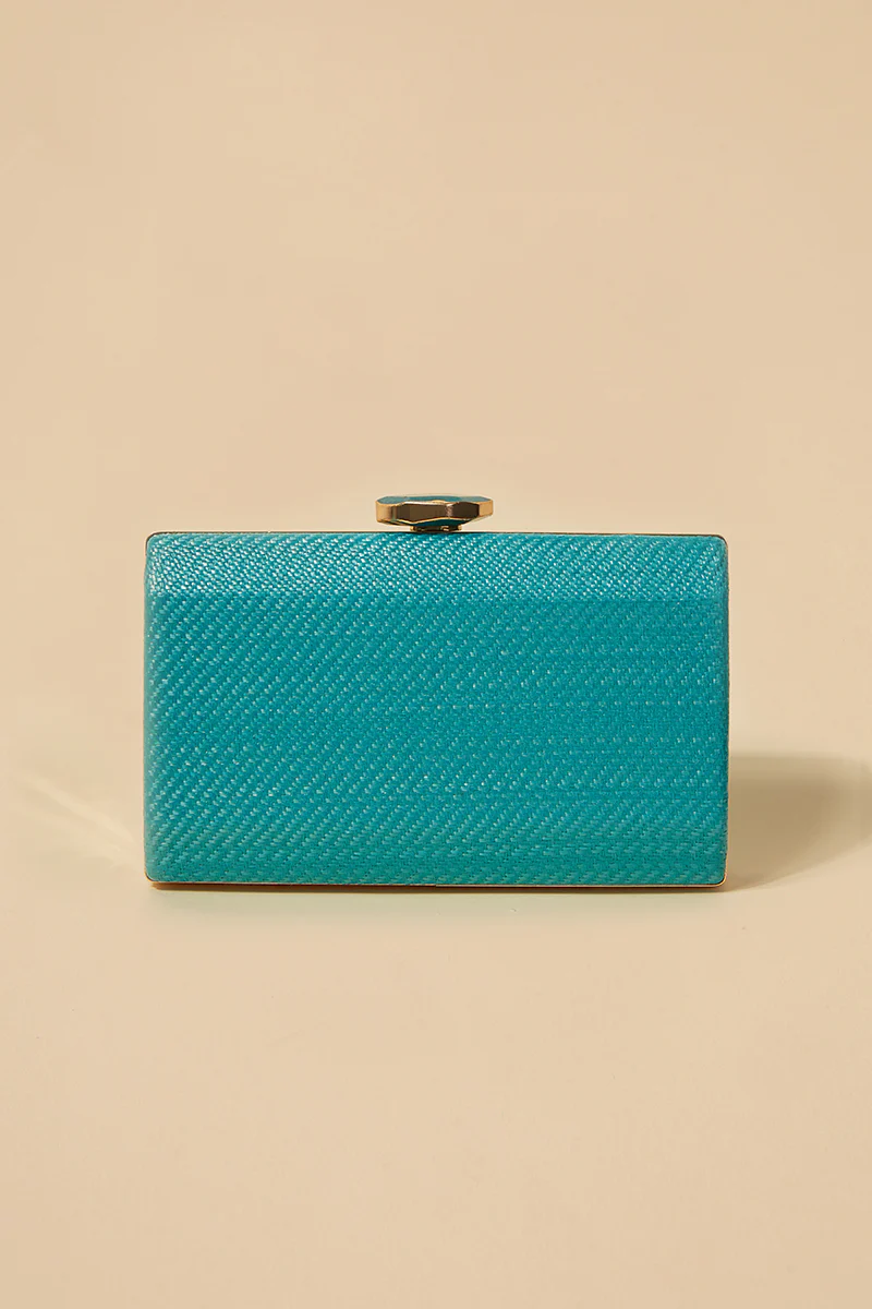 Bolso de fiesta para invitadas tipo caja rectangular realizado en rafia trenzada con cierre metal con pieza decorativa.