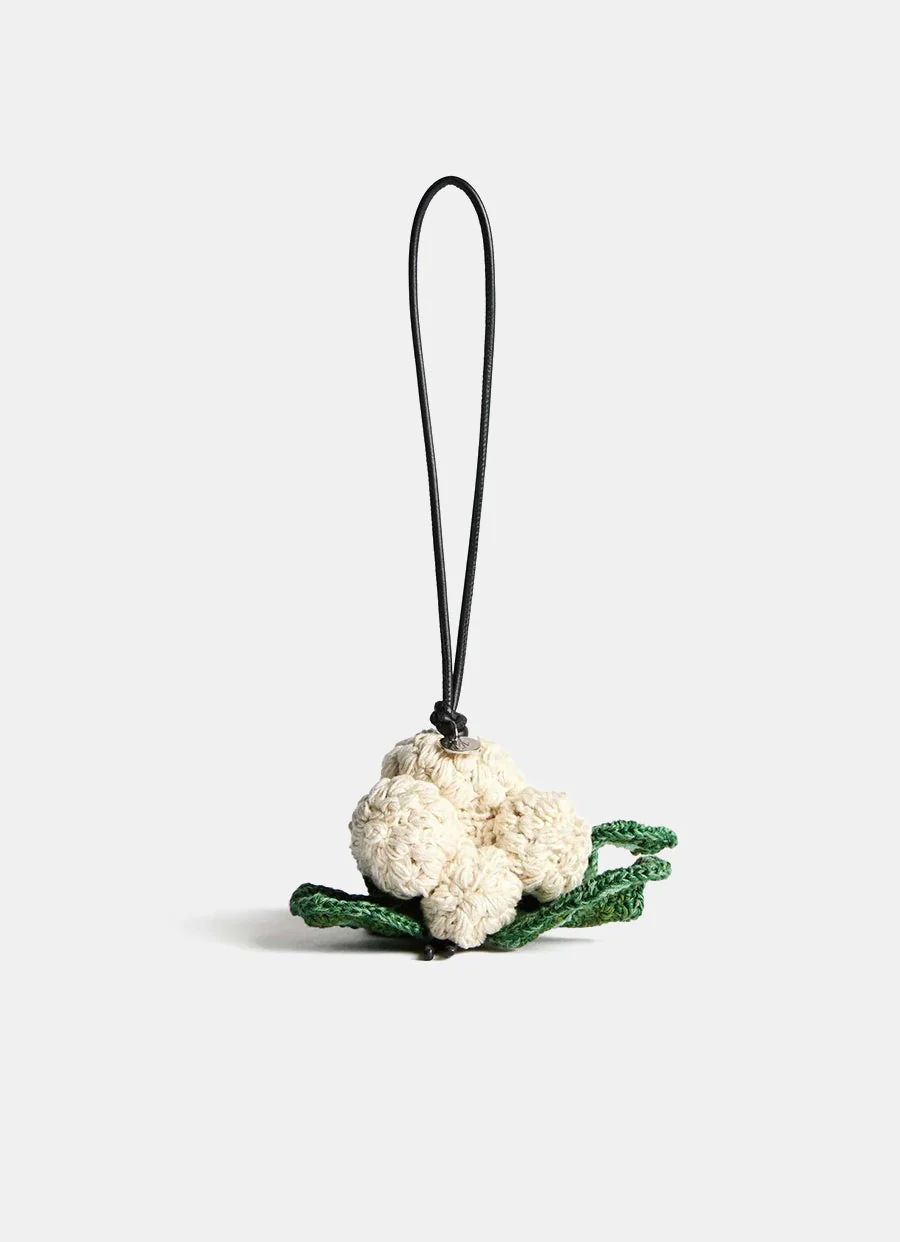 Colgante de coliflor tejido a mano de JW Anderson en hilo de algodón mercerizado con medallón plateado grabado con el logotipo y cordón de cuero. Con correa de 18cm de largo y una longitud total de 34.5cm. Dimensiones: 6 x 7 x 9cm.